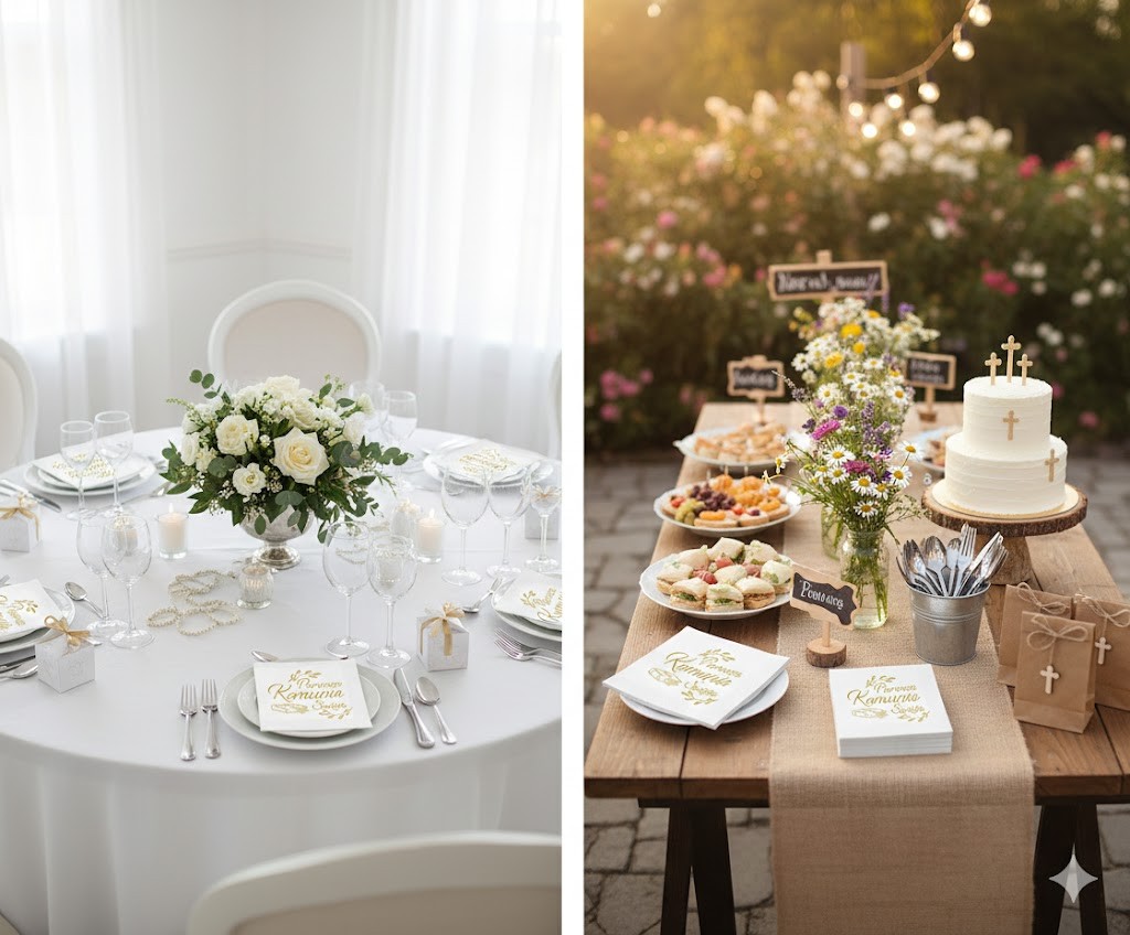 Serwetki mogą być układane przy nakryciach gości lub wykorzystywane jako element spójnej aranżacji stołu komunijnego.