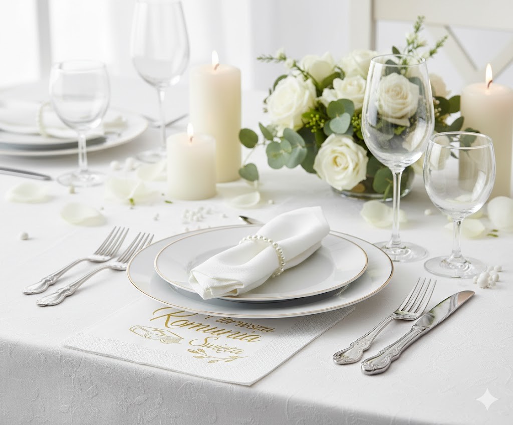 Serwetki komunijne wykonane z białego, trójwarstwowego papieru, przeznaczone do dekoracji stołu podczas przyjęcia z okazji Pierwszej Komunii Świętej. Produkt łączy funkcję praktyczną z estetycznym wykończeniem stołu.