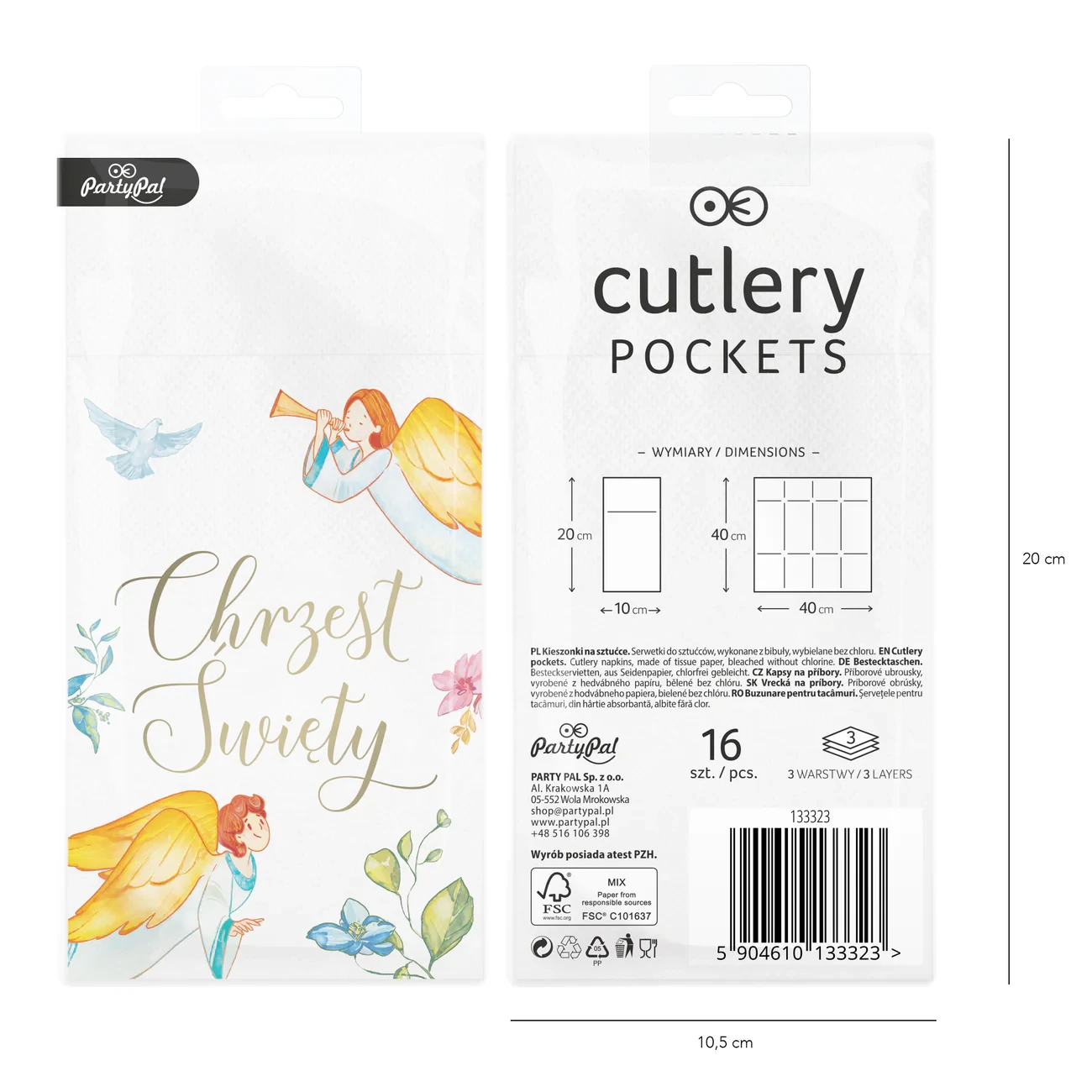 Serwetki idealnie nadają się do dekoracji stołu podczas uroczystości Chrztu Świętego lub jako dodatek na stół podczas poczęstunku gości gości zaproszonych na Chrzest Święty w domu lub restauracji. Serwetki ekologiczne ulegają biodegradacji. Kieszonki na sztućce z napisem Chrzest Święty i aniołkami będą wspaniałą i praktyczną ozdobą uroczystej zastawy stołowej. Piękne kolorowe motywy z aniołkami, gołąbkiem i kwiatkami podkreślają dziecięcy i wyjątkowy charakter uroczystości.