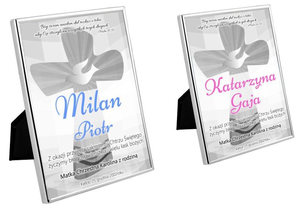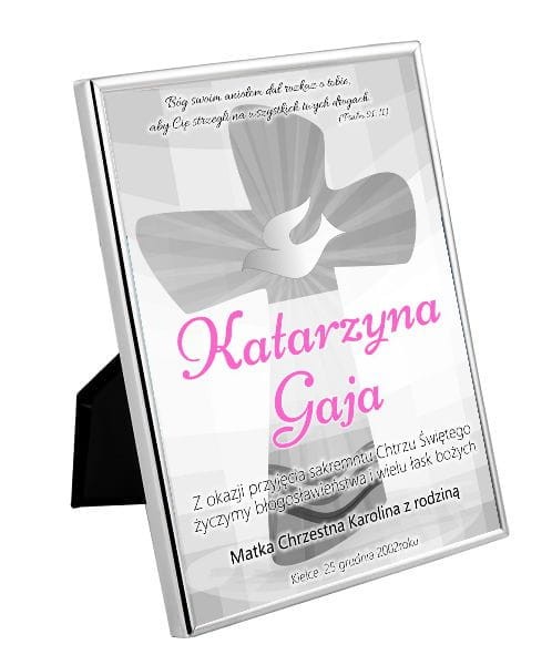 Posrebrzana ramka a w niej spersonalizowany nadruk wykonany na satynowym materiale dzięki czemu nie wyblaknie i będzie pamiątka na wiele lat. Projekt nadruku jest z krzyżem oraz symbolami Chrztu Świętego.