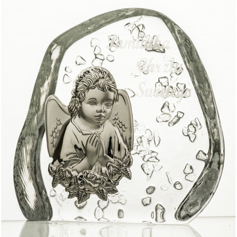 Skałka wykonana jest z wysokiej jakości szkła kryształowego o krystalicznej barwie i posrebrzanym wizerunkiem Anioła.