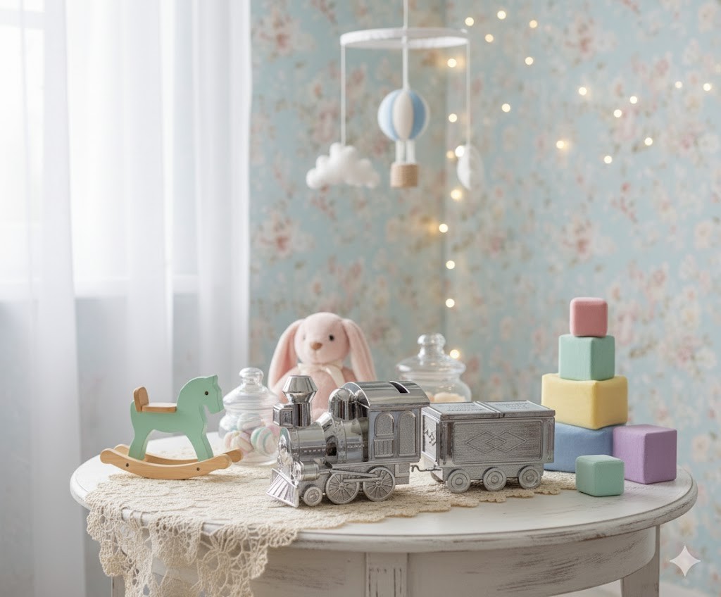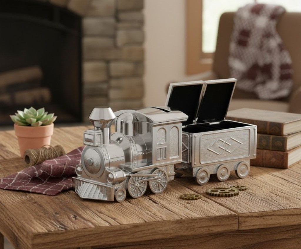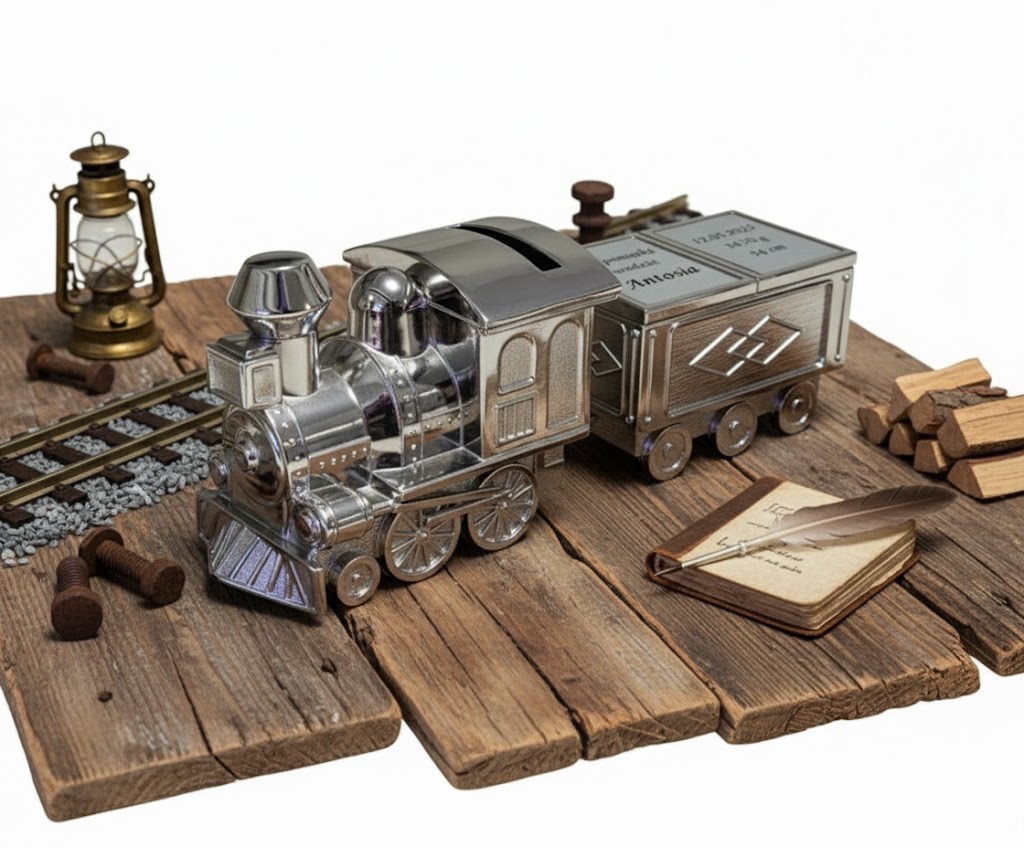 Ta wyjątkowa skarbonka została zaprojektowana z myślą o uroczystościach dziecięcych: chrzcie, pierwszych urodzinach lub roczku. Przyjmuje formę stylizowanego pociągu z wagonikiem, co czyni ją nie tylko praktycznym miejscem na oszczędności, ale również estetyczną dekoracją pokoju dziecięcego. Dodatkowo wagonik posiada otwierane górą klapkę z miejsce z dwoma miejscami wyłożonymi welurem na mały drobiazg jak ząbek, monetę, biżuterię.