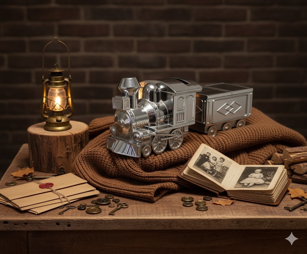 Forma: pociąg z wagonikiem — symbol podróży życia i rodzinnej historii.
