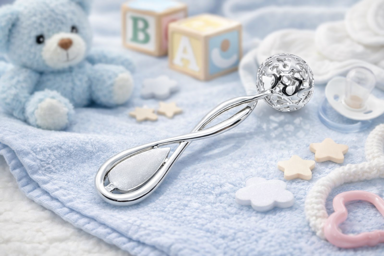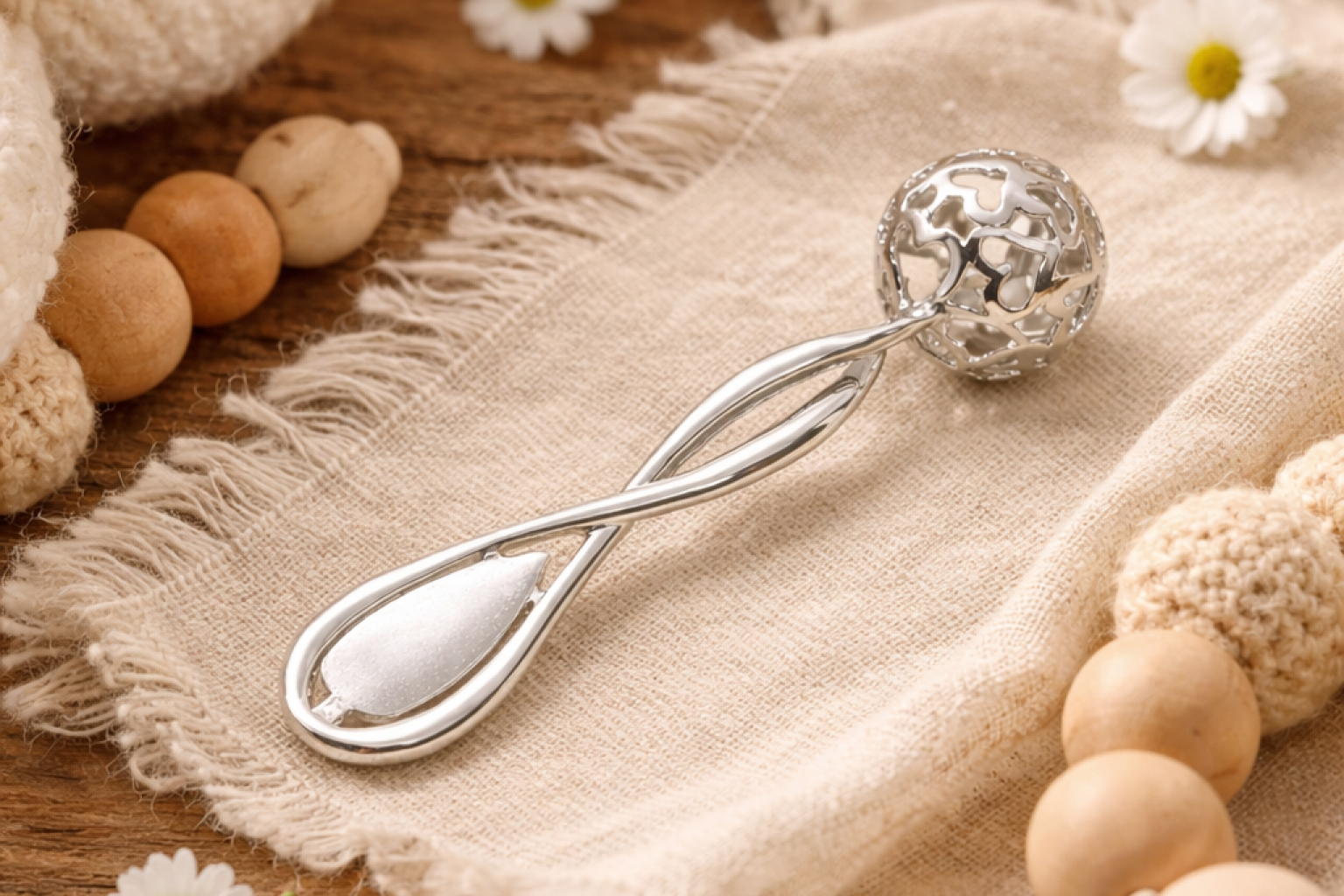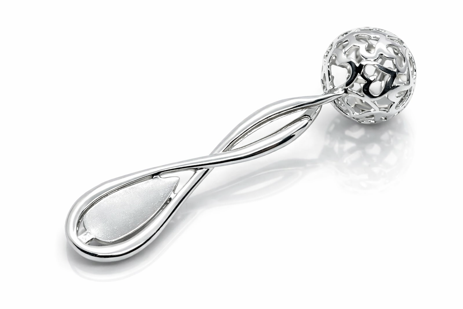 Produkt posiada klasyczną formę z ozdobną, ażurową kulką, która pełni funkcję grzechotki. Dzięki niewielkim rozmiarom może być przechowywana jako pamiątka rodzinnego wydarzenia lub element kolekcjonerski o wartości sentymentalnej.