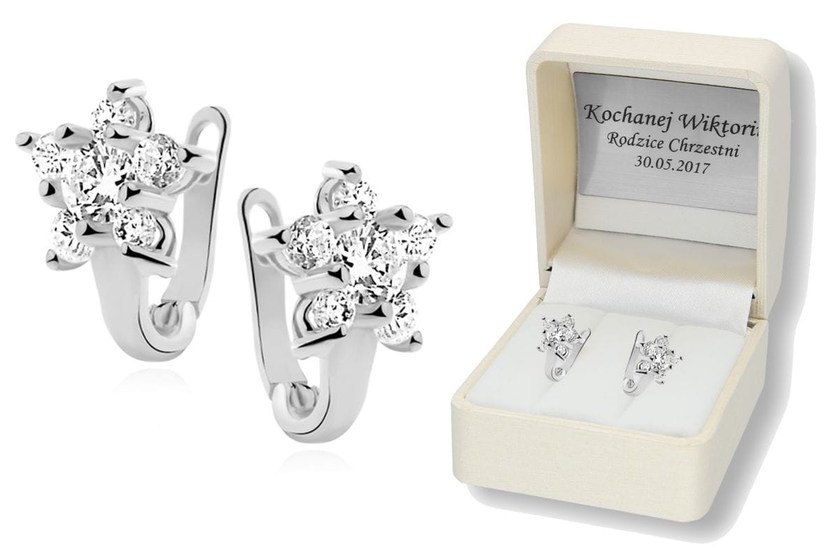 Eleganckie srebrne kolczyki z cyrkoniami (pr.925) w pudełeczku z grawerem
