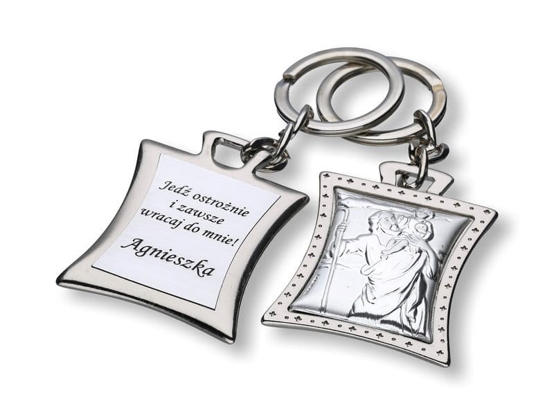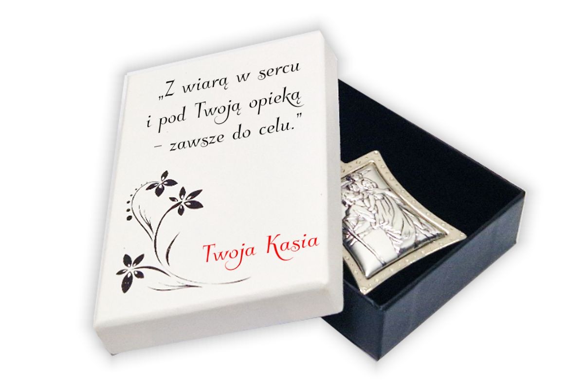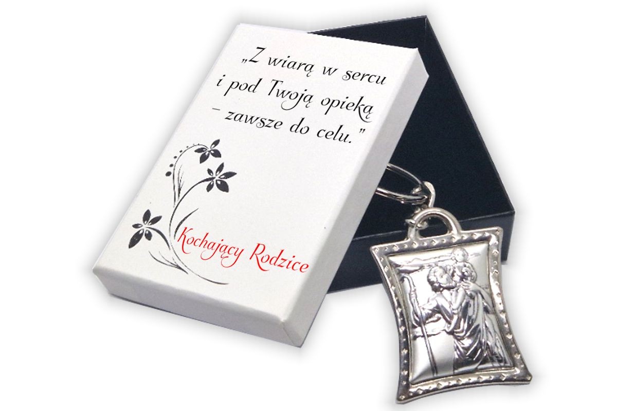 Srebrny brelok Świętego Krzysztofa z grawerem w ekskluzywnym pudełku z życzeniami!