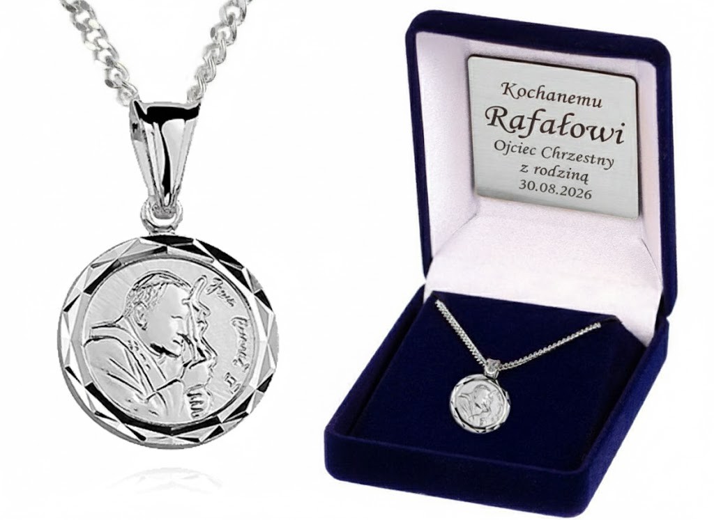 Srebrny medalik Św. Jana Pawła II z łańcuszkiem – próba 925, w pudełku z dedykacją
