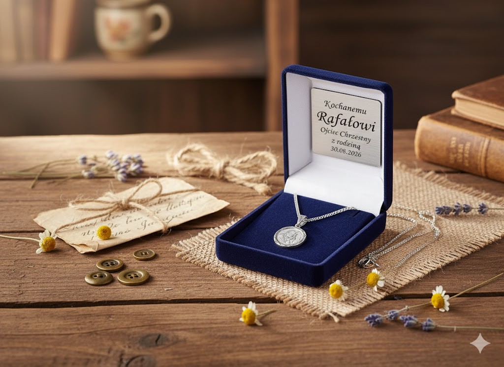 Zestaw obejmuje medalik i solidny łańcuszek typu pancerka, dzięki czemu całość jest trwała, elegancka i doskonale nadaje się do codziennego noszenia. Komplet zapakowany jest w pudełko prezentowe z możliwością wykonania grawerowanej dedykacji, co czyni go idealnym prezentem na Chrzest, Komunię, Bierzmowanie, urodziny czy jako osobisty znak wiary.
