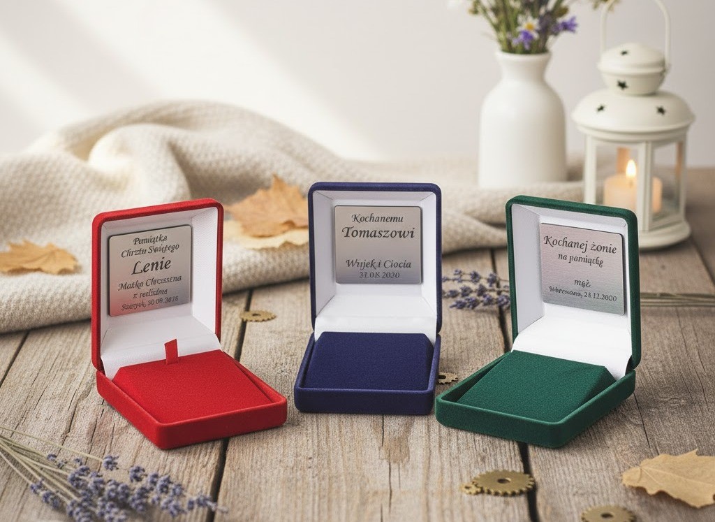 W pudełku znajduje się tabliczka, na której można umieścić trwały, laserowy grawer: