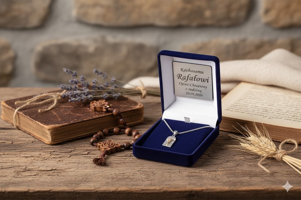 Zestaw umieszczony jest w eleganckim pudełku z opcją wykonania grawerowanej dedykacji — imienia, daty lub krótkiej sentencji, co zamienia go w niepowtarzalną, osobistą pamiątkę na całe życie. To doskonały prezent z okazji Chrztu, I Komunii Świętej, Bierzmowania, ślubu czy jubileuszu wiary.