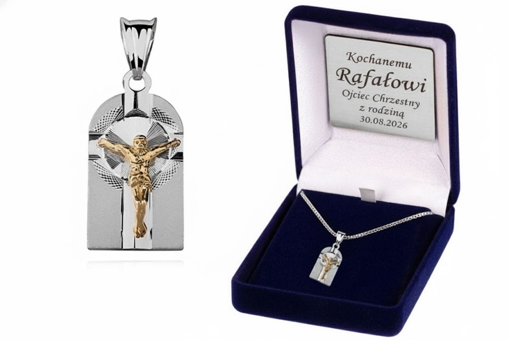 Medalik z Jezusem na Krzyżu i łańcuszek (pr. 925) w pudełeczku z grawerem
