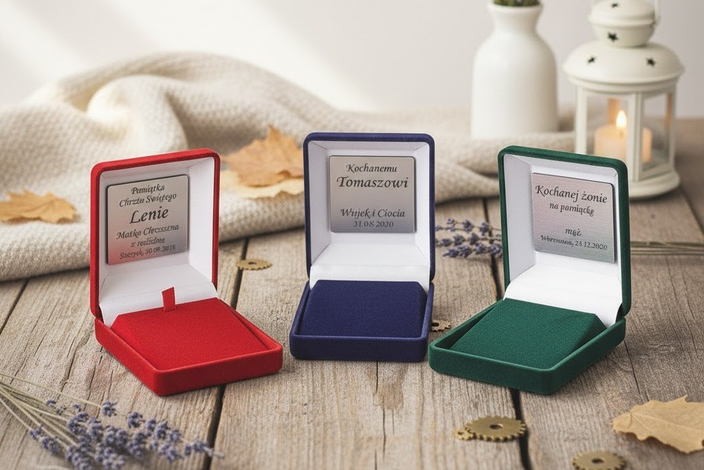Twój zestaw może stać się absolutnie wyjątkowy — dodaj imię, datę, cytat biblijny lub życzenia. Grawer wykonujemy techniką laserową z wieczystą gwarancją trwałości, dzięki czemu pamiątka zachowa swój charakter na wiele lat.