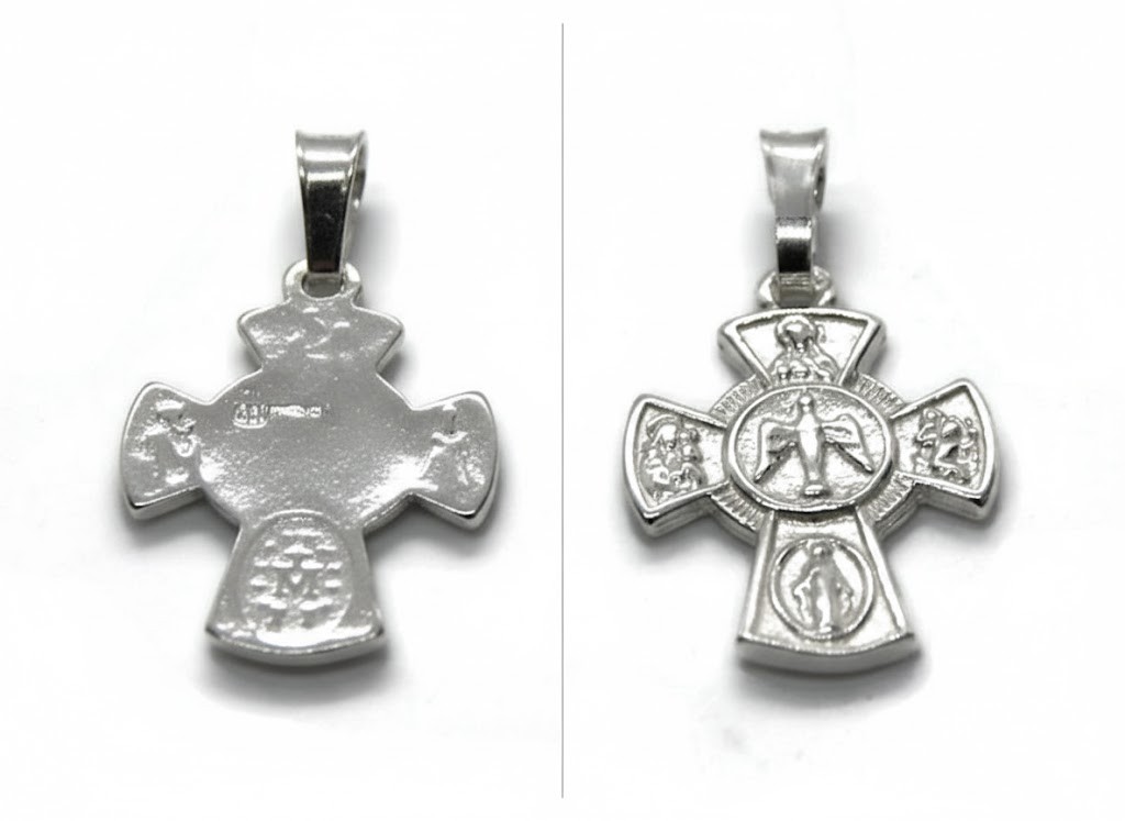 Centralną część medalika zajmuje wizerunek Ducha Świętego w postaci gołębicy – znaku pokoju, światła i prowadzenia przez Bożą obecność. Na ramionach krzyża umieszczono cztery subtelne reliefy przedstawiające świętych i sceny religijne, co podkreśla zakorzenienie tego medalika w duchowej tradycji chrześcijaństwa.