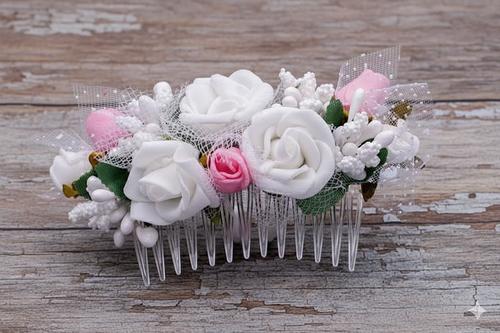 Stroik osadzony jest na przezroczystym grzebyku, zapewniającym stabilne i wygodne mocowanie we włosach. Doskonale sprawdzi się zarówno przy klasycznych kokach, jak i przy półupięciach czy luźniejszych fryzurach komunijnych.