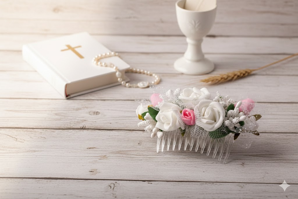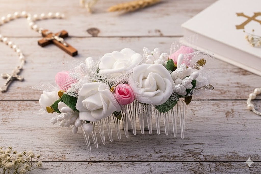 Ten stroik komunijny do włosów to wyjątkowo subtelna i elegancka ozdoba, łącząca klasyczną biel z delikatnym, dziewczęcym akcentem pudrowego różu. Kompozycja oparta na białych kwiatach została uzupełniona niewielkimi różowymi pąkami, które nadają całości lekkości i świeżości, zachowując jednocześnie bardzo spokojny, komunijny charakter.