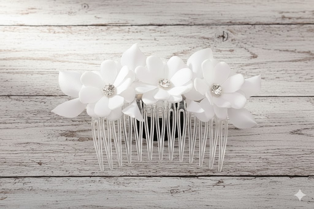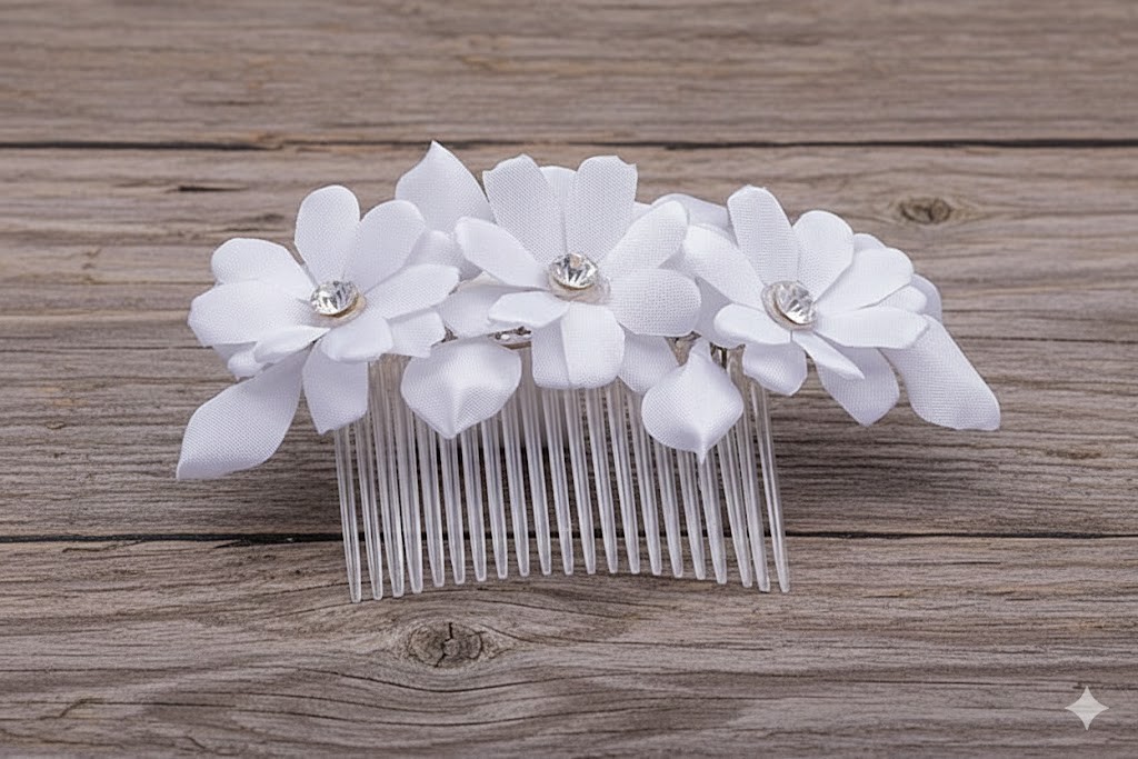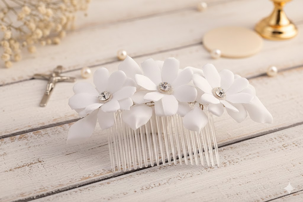 Ten stroik komunijny do włosów to idealne połączenie prostoty, czystości formy i delikatnego blasku. Białe kwiaty z kryształowym środkiem tworzą spokojną, elegancką ozdobę, która pięknie dopełnia komunijną stylizację.