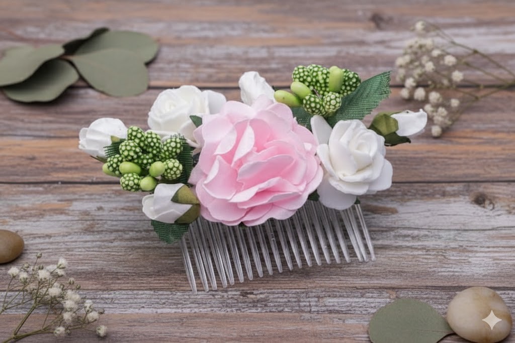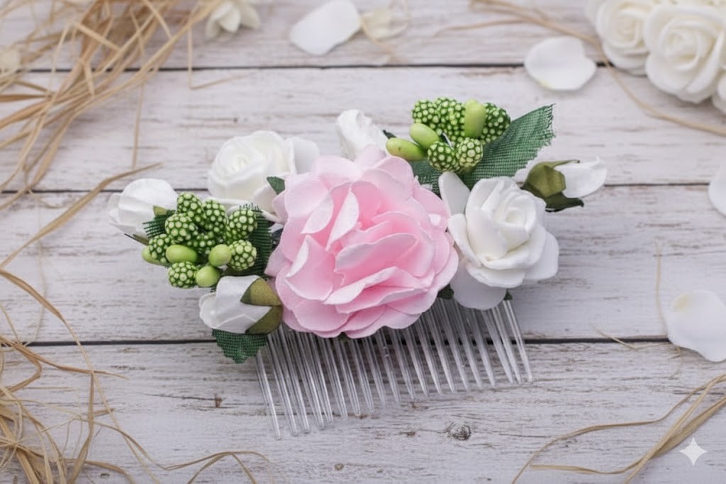 Ten stroik komunijny do włosów to idealne połączenie subtelnego różu, czystej bieli i naturalnej zieleni. Delikatna piwonia w centrum nadaje fryzurze wyjątkowego charakteru, zachowując jednocześnie elegancję i lekkość odpowiednią na Pierwszą Komunię Świętą.