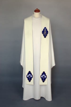 Stuła Maryjna zdobiona haftem na aksamitnych aplikacjach.