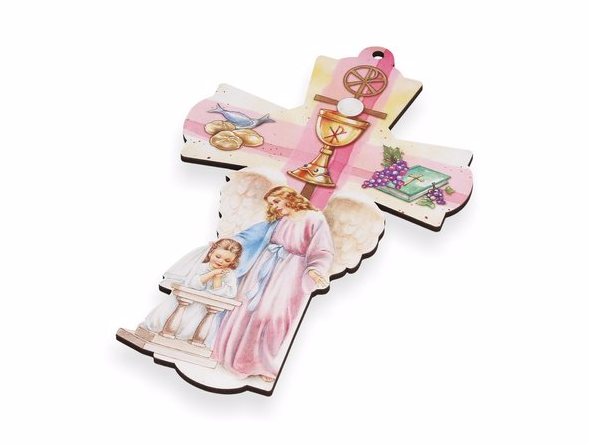 Krzyż drewniany z motywem komunijnym utrzymany w tonacji różowej dla dziewczynki. Piękna pamiątka z okazji Pierwszej Komunii Świętej!