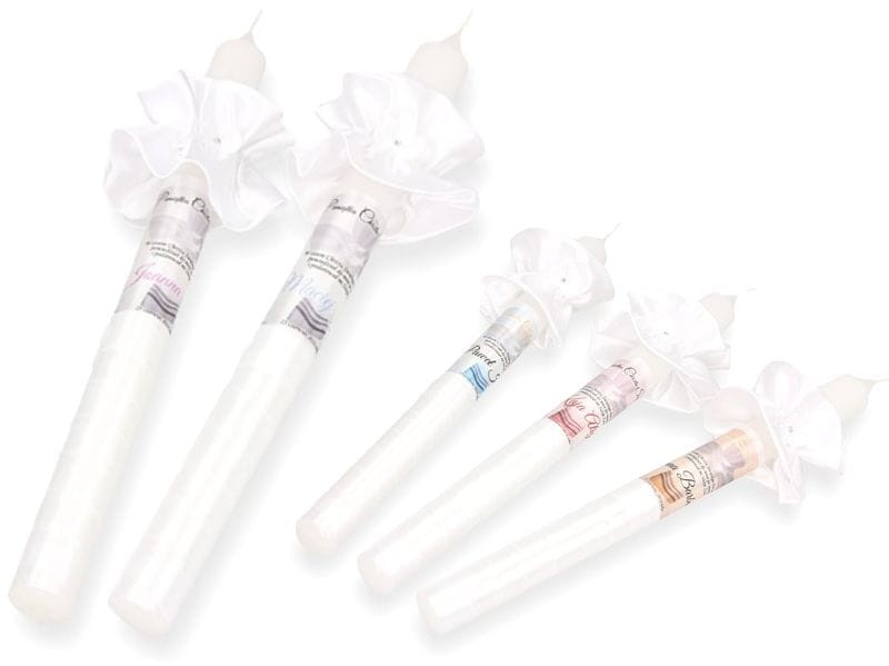 Niezapomniana pamiątka z okazji Sakramentu Chrztu Świętego. Świeca ręcznie dekorowana z ozdobnym stroikiem, dzięki któremu nie potrzebujesz już dodatkowych okapników i profitek.