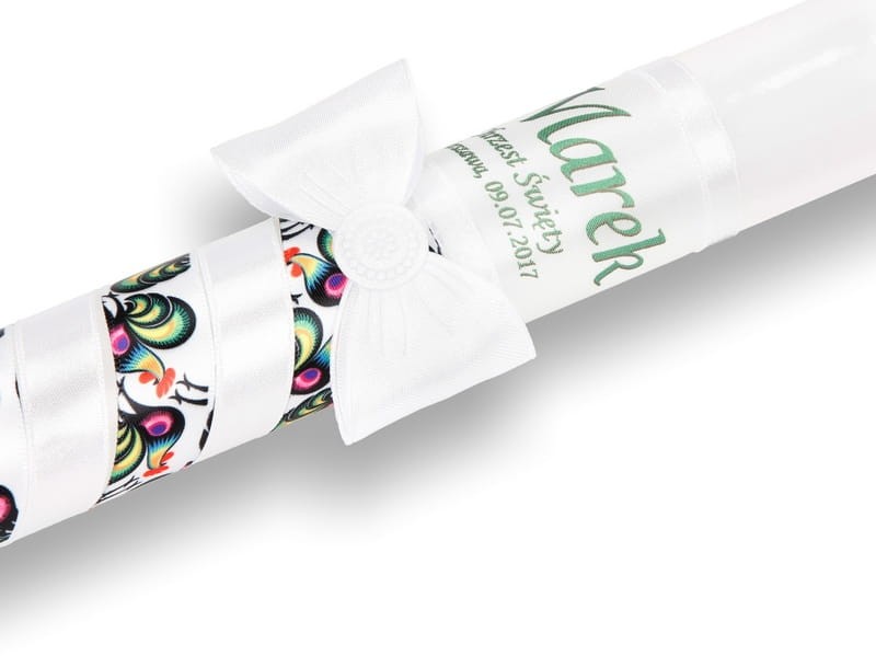 - ręcznie zdobionej świecy, dekorowanej wstążką z regionalnymi wzorami ludowymi