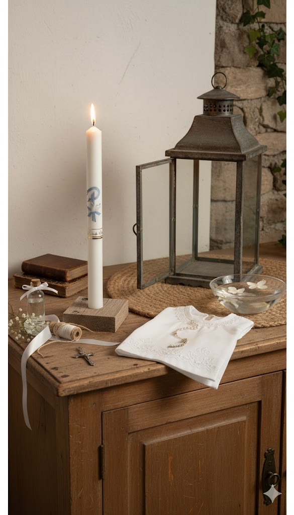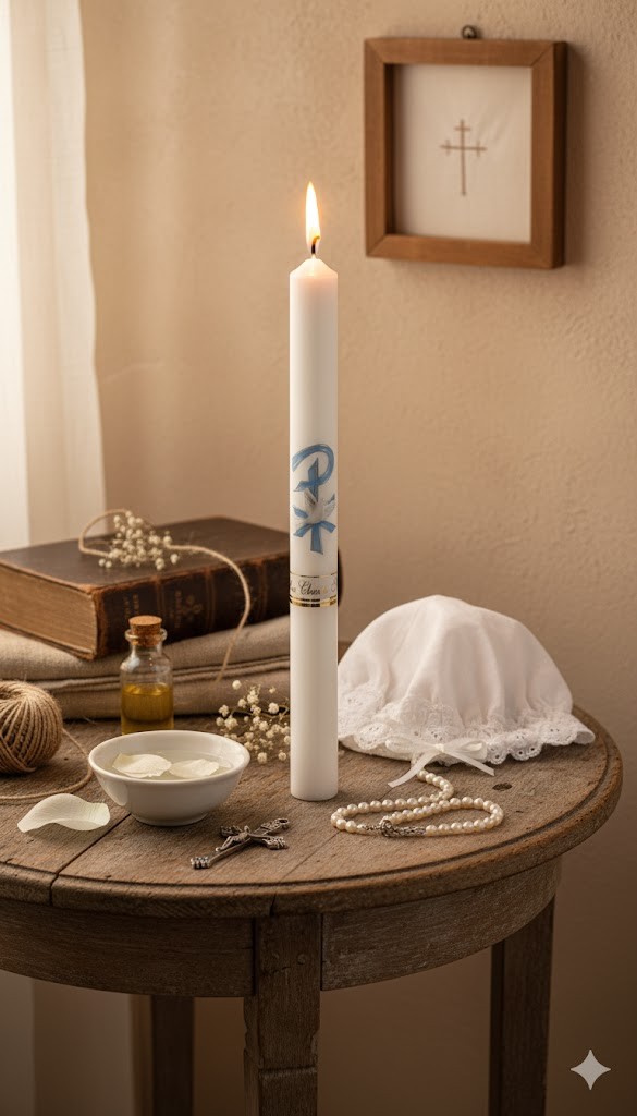 Świeca chrzcielna to nie tylko dekoracja — to znak światła Chrystusa, które w momencie chrztu staje się udziałem dziecka przyjętego do wspólnoty Kościoła. Motyw gołębicy to obraz Ducha Świętego zstępującego na nowo ochrzczonego, wprowadzając go w życie łaski i pokoju. Błękitny akcent podkreśla radosne wejście w nową drogę wiary i czystość serca.