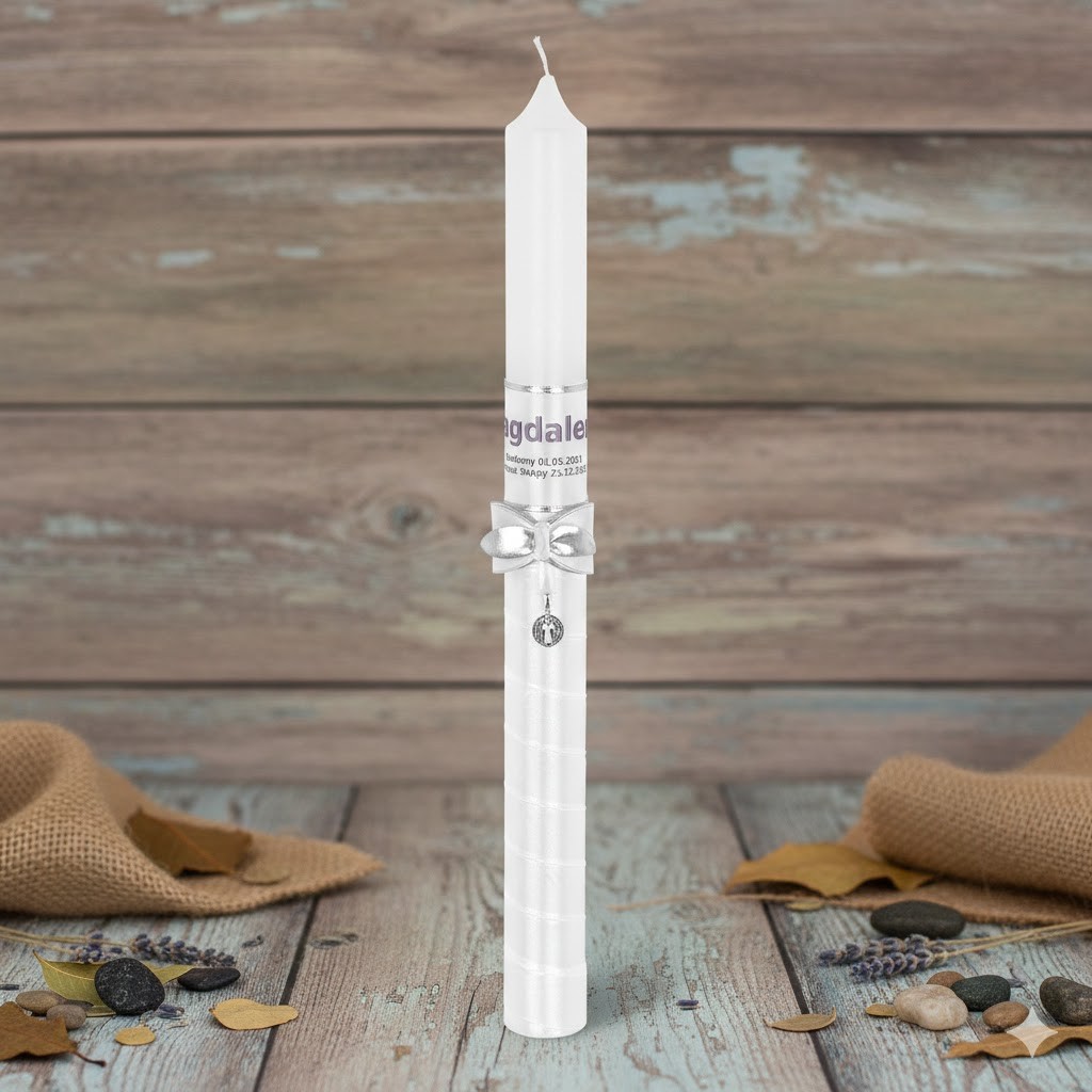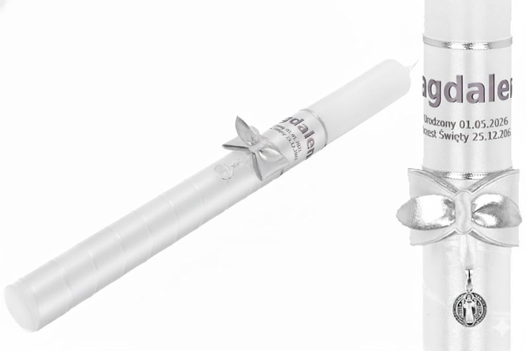 Ręcznie zdobiona świeca chrzcielna z imieniem dziecka i datą uroczystości, ozdobiona srebrnym medalikiem św. Benedykta (srebro 925). To wyjątkowy znak wiary i duchowej opieki, który towarzyszyć będzie dziecku od dnia Chrztu Świętego przez całe życie.