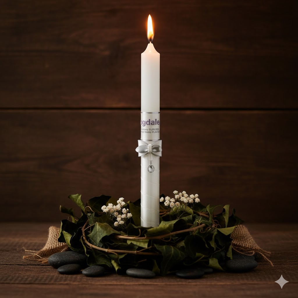 Personalizacja jest wykonywana trwałą metodą, dopasowaną kolorystycznie do zdobień. Dzięki temu świeca staje się pamiątką o niezwykłej wartości emocjonalnej i duchowej.