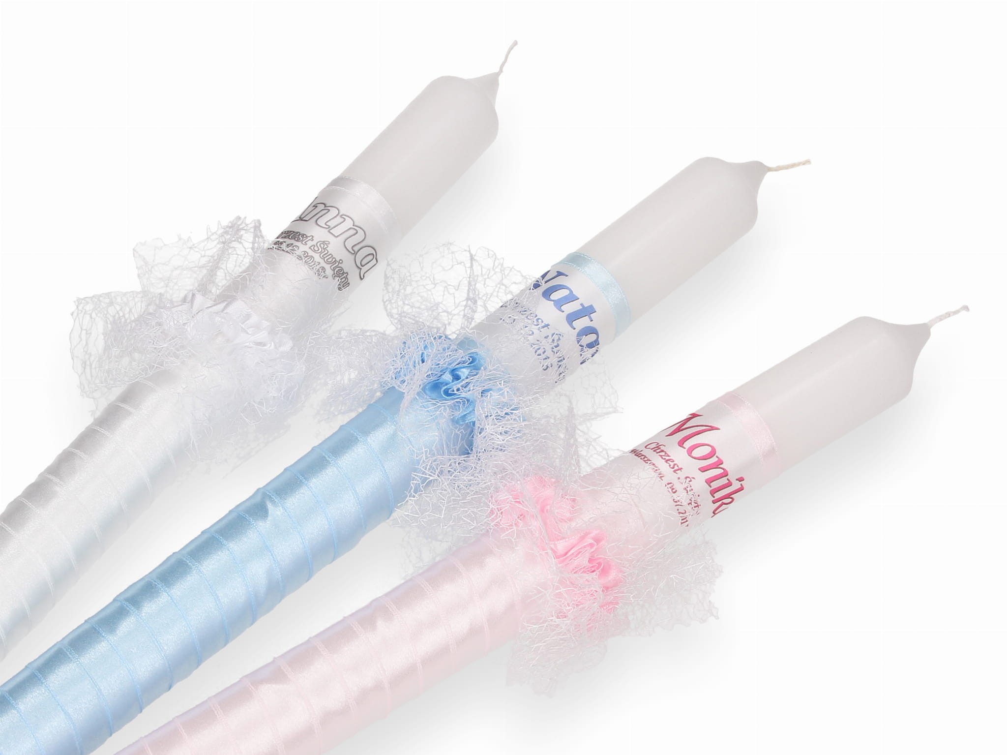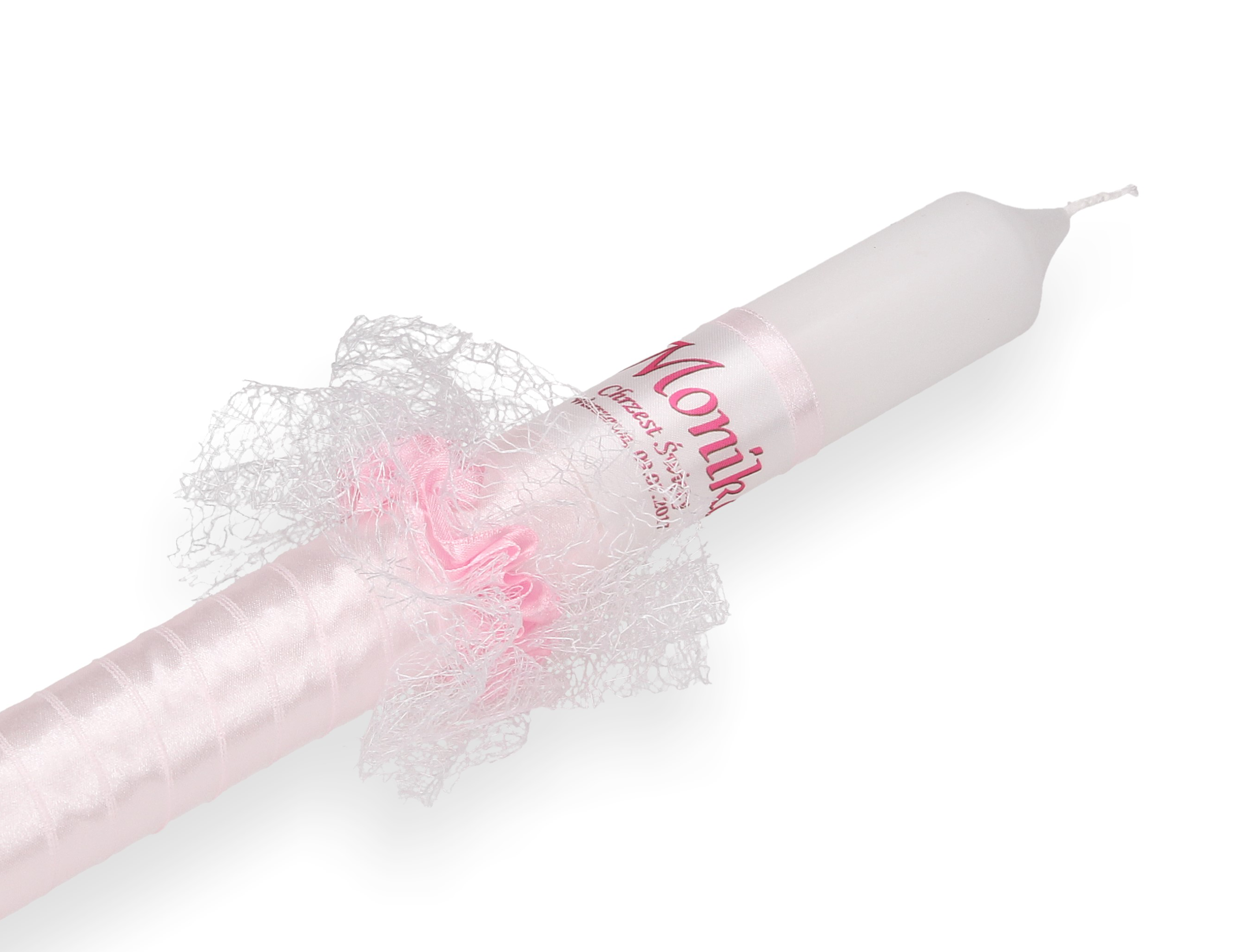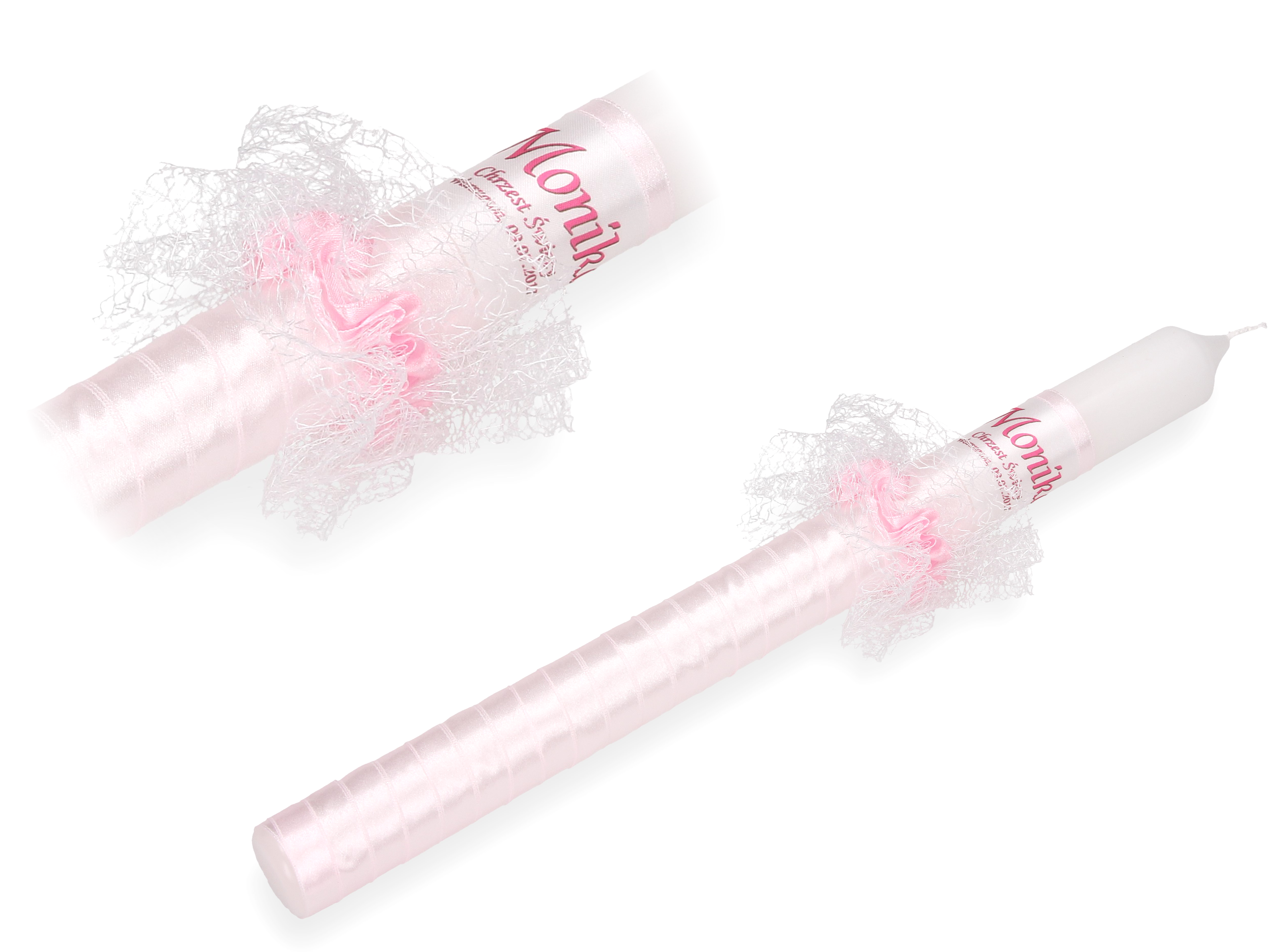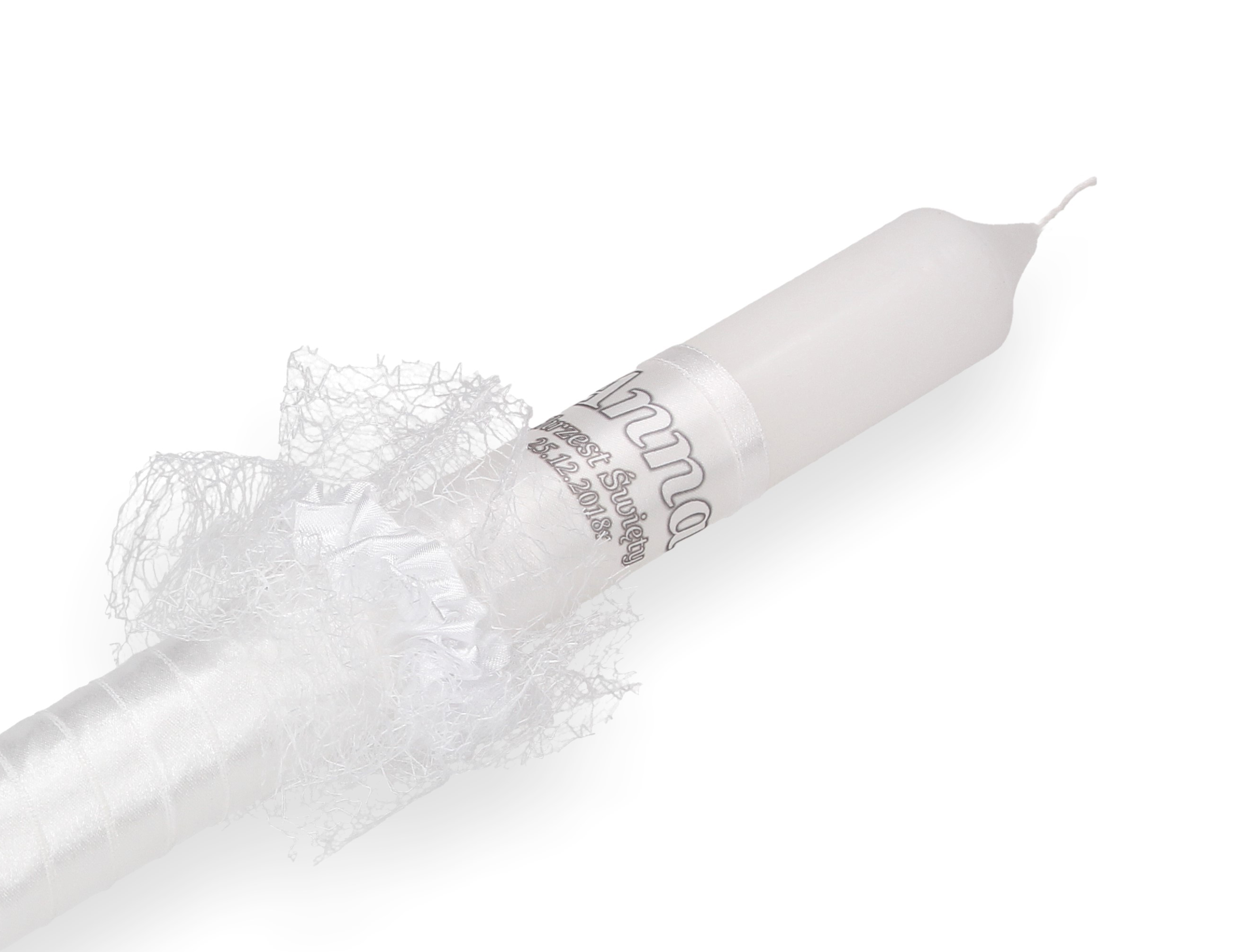 Świeca ręcznie dekorowana z imionami dziecka i data uroczystości zdobiona delikatną ozdoba "mgiełka", przez co nie potrzeba dodatkowej ochrony w formie okapnika.