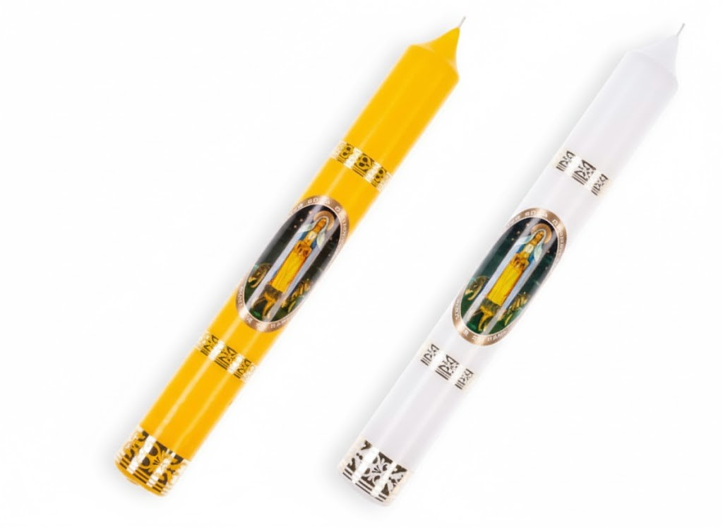 Produkt dostępny jest w dwóch wariantach kolorystycznych: białym i żółtym. Z uwagi na produkcyjny charakter zdobienia, wizerunek na naklejce może różnić się od przedstawionego na zdjęciu, zachowując jednak tematykę Matki Bożej Gromnicznej.