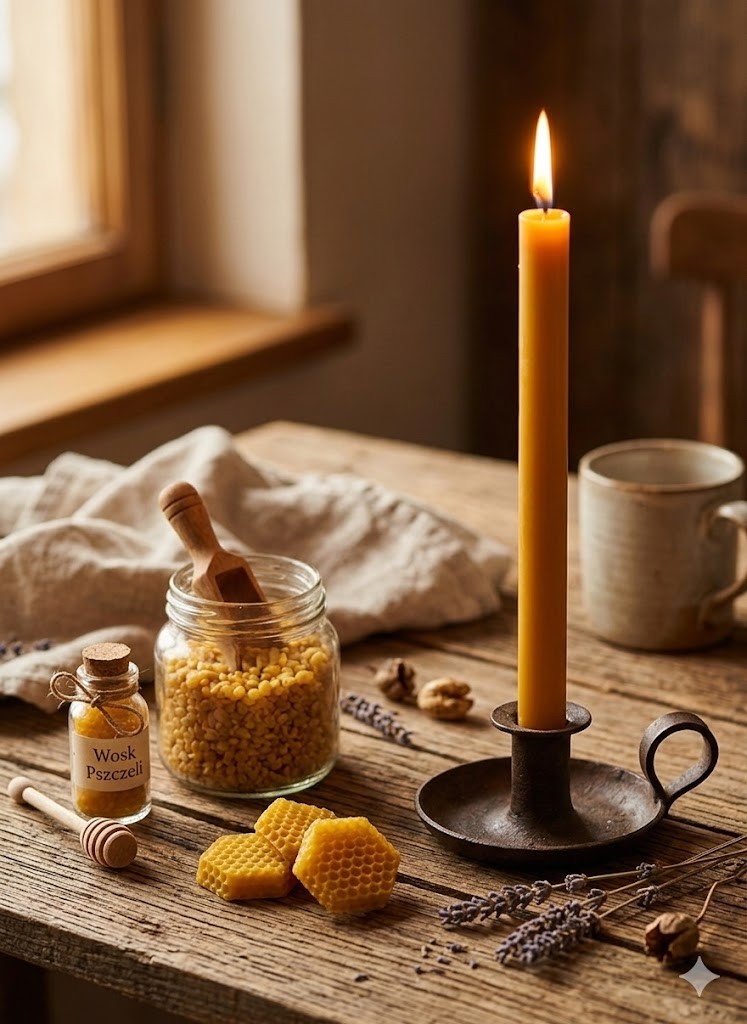 Świeca wykonana jest w 75% z wosku pszczelego, dzięki czemu: