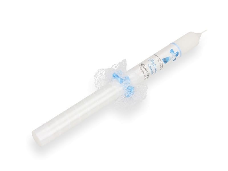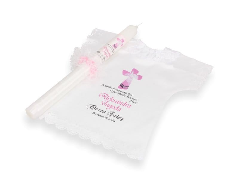 Świeca i szatka do chrztu z imieniem i ozdobnym stroikiem MGIEŁKA (chusta)
