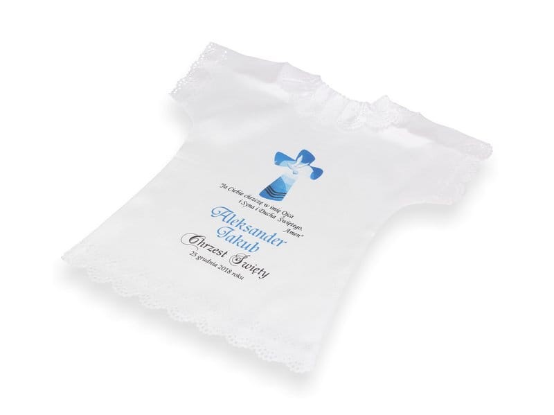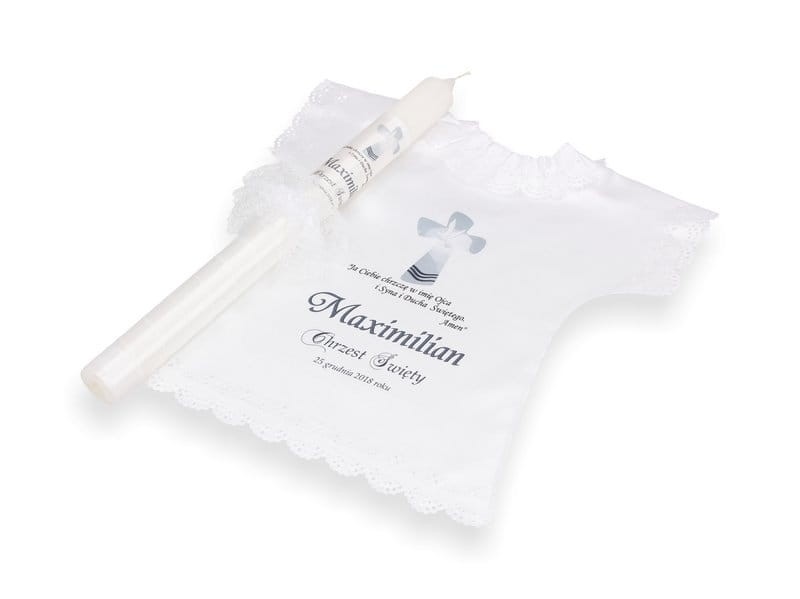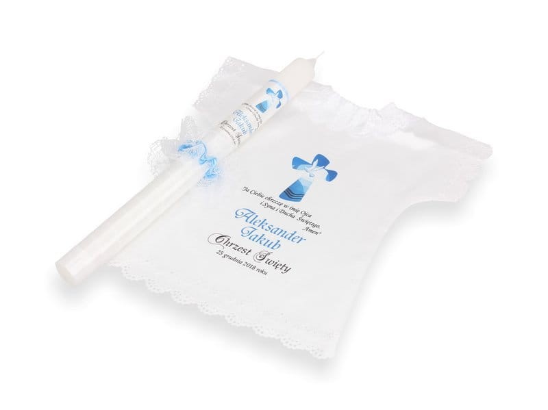 Zestaw do chrztu z imionami i datą uroczystości Zestaw składa się z ozdobnej szatki oraz świecy ręcznie dekorowanej z imionami dziecka i datą uroczystości zdobiona delikatną ozdobą "mgiełka", przez co nie potrzeba dodatkowej ochrony w formie okapnika. Nasze świece są zdobione z najwyższej jakości dodatków, produkt wysokiej klasy, dobrej jakości wosku, niekapiąca, nie kopcąca polskiego producenta. Całość wygląda elegancko i gustownie.