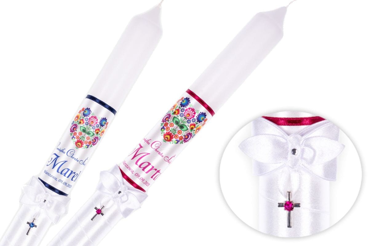 Świeca na Chrzest FolkStyle® - motyw "łowicki" plus srebrny krzyżyk z cyrkonią