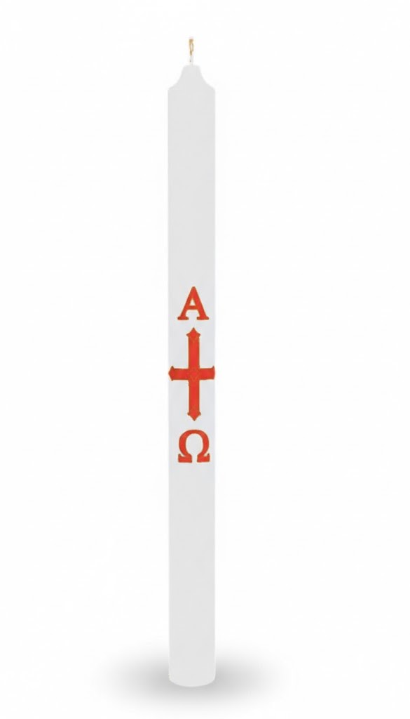 Świeca wykonana została z parafiny i ma smukłą formę odpowiednią do użytku liturgicznego. Na jej powierzchni umieszczono wielkanocną naklejkę z motywem krzyża oraz symbolami Alfa i Omega, odnoszącymi się do Chrystusa jako Początku i Końca.