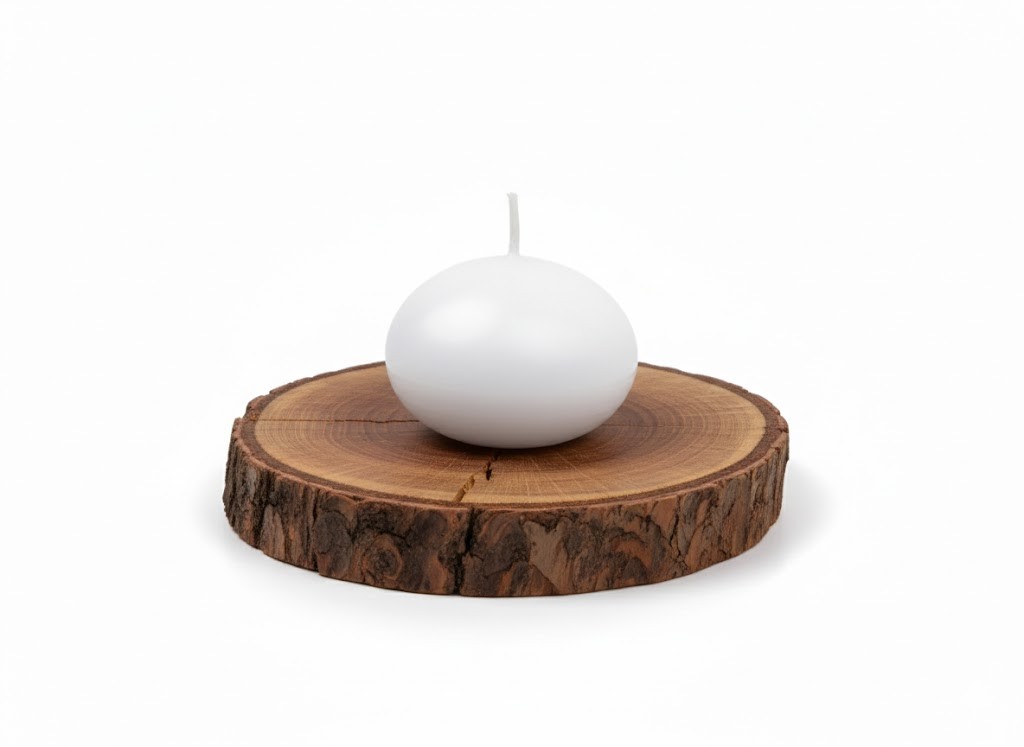 Świeca pływająca w formie płaskiego dysku, wykonana z parafiny w matowym, białym wykończeniu. Przeznaczona do umieszczania na powierzchni wody, gdzie utrzymuje stabilną pozycję podczas palenia.