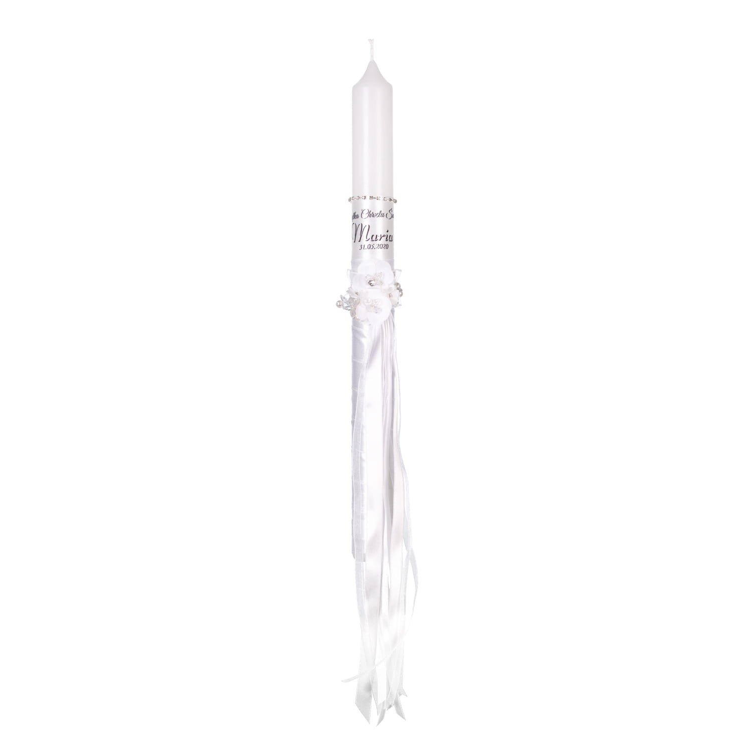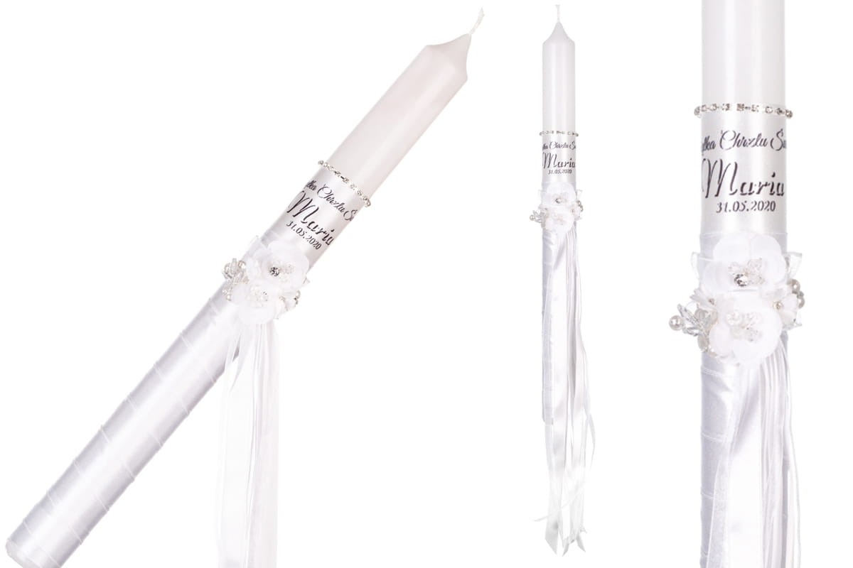 Idealna na Chrzest Święty lub I Komunię Świętą. Świeca udekorowana została dodatkowym stroikiem, który w połączeniu z kryształkami i imieniem staje się pamiątką na długie lata.