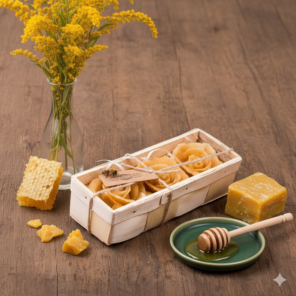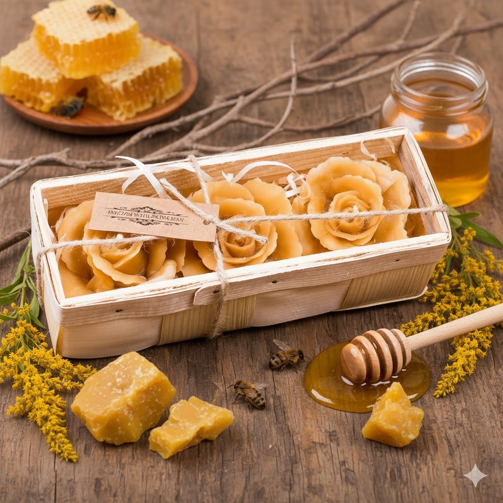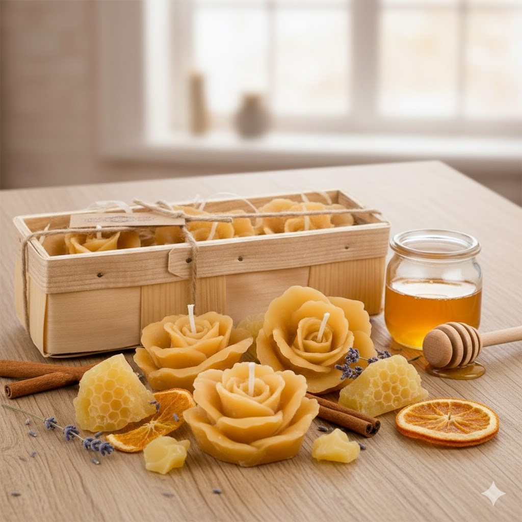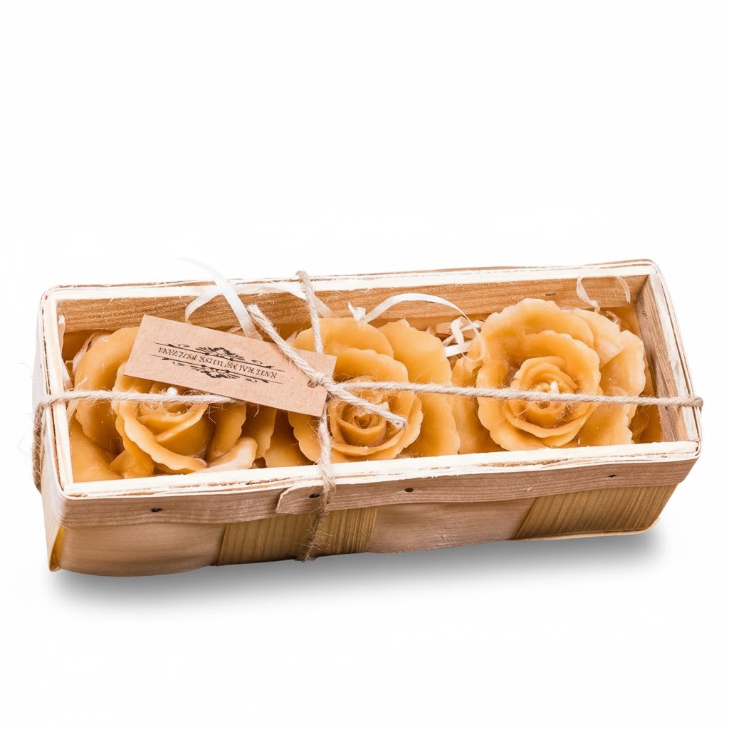 Świeca woskowa róża – naturalny wosk pszczeli, 3 sztuki w łubiance
