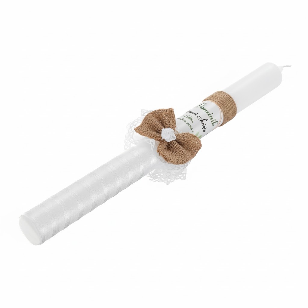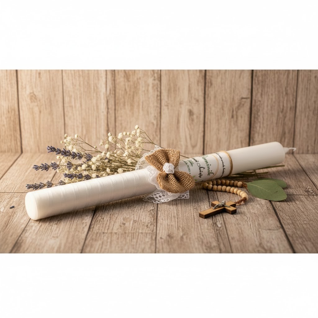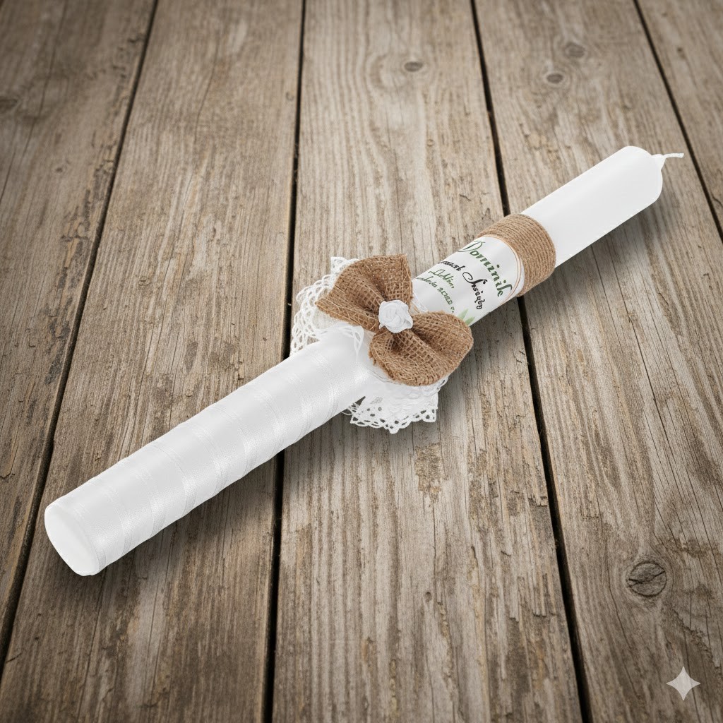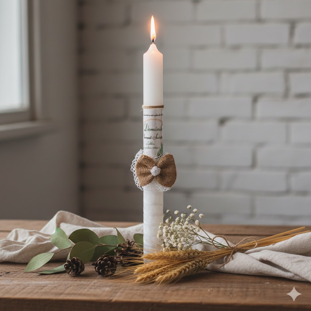 Naturalna i elegancka świeca chrzcielna wykonana w stylu eco-friendly, idealna na Chrzest Święty lub I Komunię Świętą. Zdobiona delikatną tasiemką szyfonową oraz kokardą z naturalnej juty, podkreśla troskę o środowisko i piękno tradycyjnej symboliki chrztu.