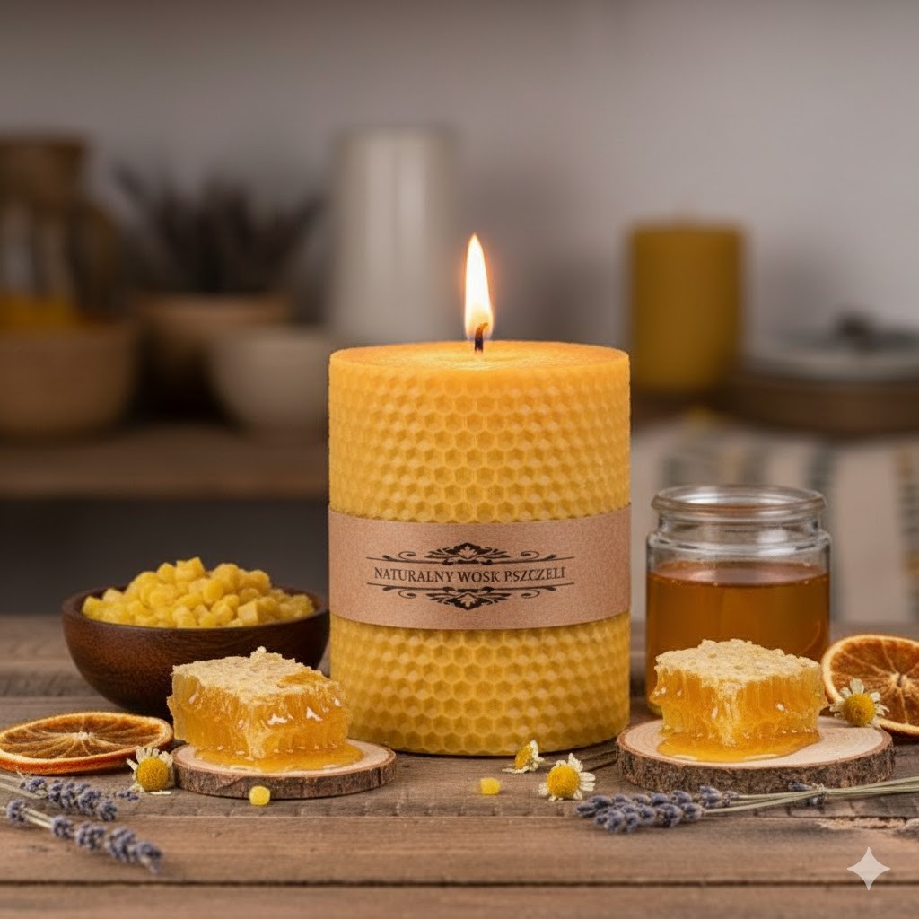 Naturalna świeca ręcznie zwijana z węzy pszczelej to produkt, który łączy tradycyjne rzemiosło pszczelarskie z piękną, symboliczną formą światła. Wykonana z czystego wosku pszczelego, zachwyca naturalnym aromatem, ciepłą barwą i delikatną strukturą plastra, charakterystyczną dla oryginalnej węzy.