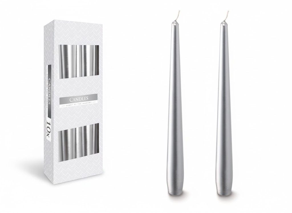 Świece stożkowe srebrny metalik – zestaw dekoracyjny, bezzapachowe