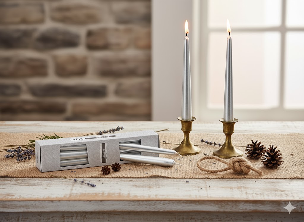 Świece dostępne są w zestawach 2 lub 10 sztuk, co pozwala dopasować liczbę do tworzonej dekoracji, stroika, kompletu kolędowego lub zestawu lichtarzy. Delikatny srebrny połysk nadaje aranżacjom wyjątkowej elegancji — od stołów świątecznych i weselnych, po przestrzeń modlitwy czy ikonę domową, wprowadzając spokój i podniosły nastrój.