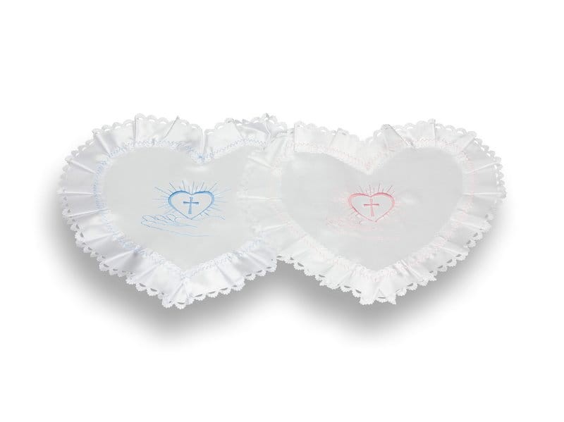Szatka wykonana z atłasowego materiału w formie serca z haftem "Serce na dłoni w kolorystyce róż i błękit do wyboru.