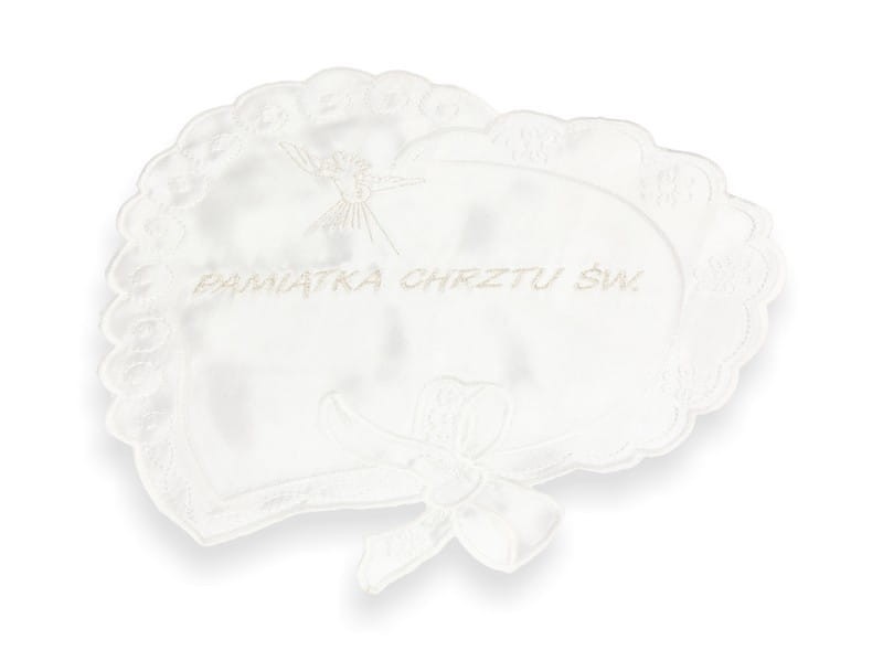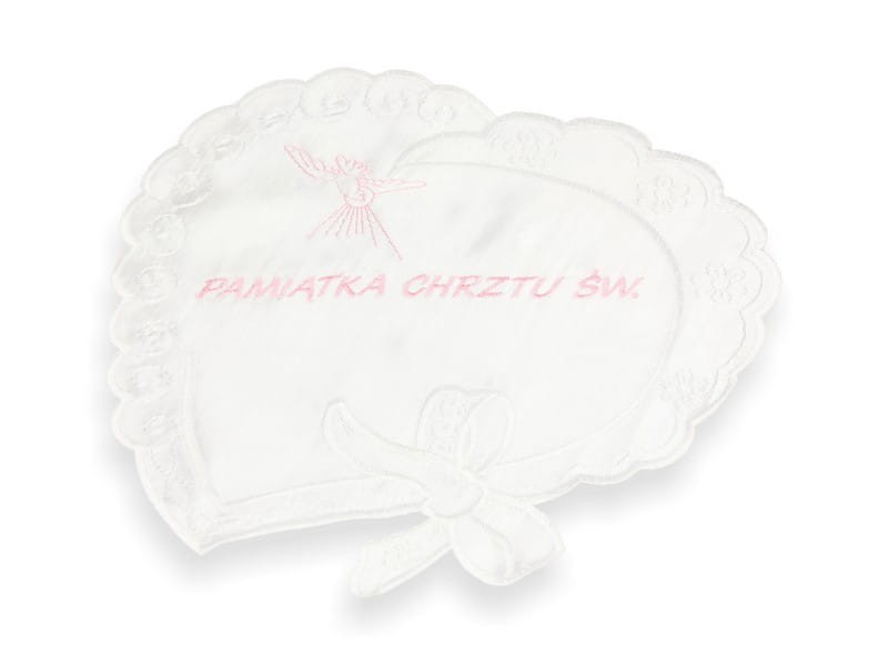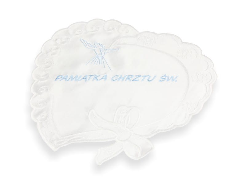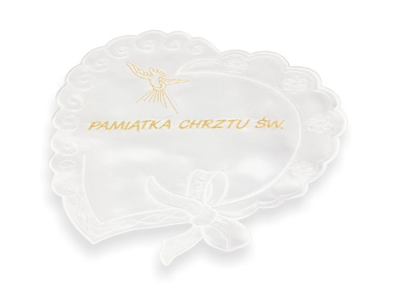 Szatka wykonana z atłasowego materiału w formie serca ze haftem Ducha Świętego i napisem Pamiątka Chrztu Świętego.