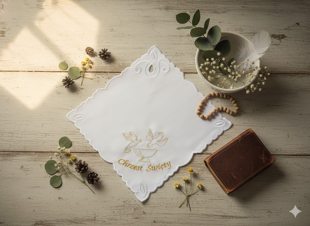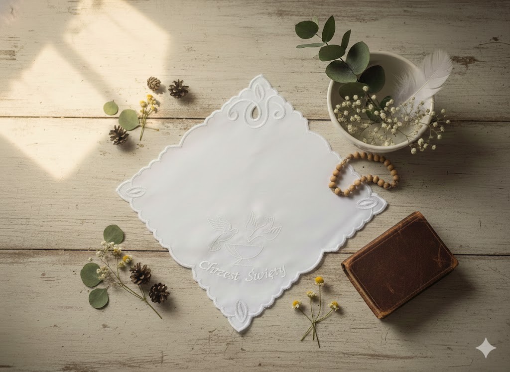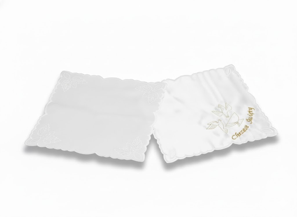 Ta wyjątkowa szatka do Chrztu została wykonana z wysokiej jakości atłasu eleganckim haftem w narożnikach i ozdobnym motywem Ducha Świętego oraz napisem „Chrzest Święty”. Jej kolorystyka — klasyczna biel — podkreśla symbol czystości i odrodzenia duchowego, który towarzyszy maluszkowi w chwili przyjęcia sakramentu. Wymiary chusteczki to 24 × 24 cm, co czyni ją komfortową w użyciu podczas ceremonii i łatwą do zachowania jako pamiątka. Haftowana forma Richelieu dodaje finezji i wyrafinowania, a każdy szczegół przypomina o Bożym błogosławieństwie i opiece. Dzięki niej zarówno dziecko, jak i rodzice mogą poczuć, że moment Chrztu staje się wyjątkowy i naznaczony obecnością łaski.