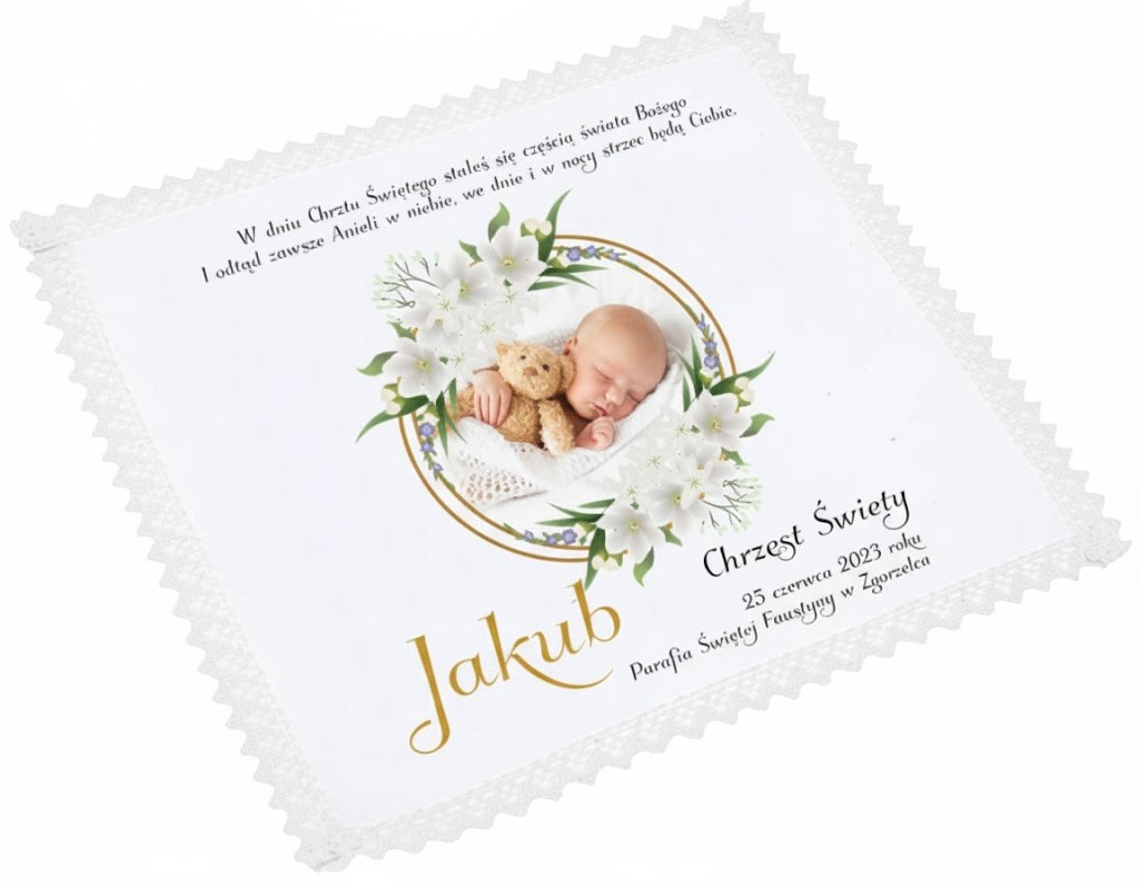 Ta wyjątkowa szatka na Chrzest została przygotowana z myślą o upamiętnieniu najważniejszego dnia w życiu maluszka — sakramentu Chrztu Świętego. Dzięki możliwości nadruku zdjęcia dziecka oraz imienia i daty chrztu staje się ona osobistą pamiątką, która przypomina o Bożym przyjęciu i duchowej odnowie. Materiał jest starannie dobrany — atłasowa tkanina lub inna wysokiej jakości tkanina zapewnia piękny wygląd i trwałość użytkowania. Biel szatki symbolizuje czystość i nowe życie w Chrystusie, a delikatne wykończenia oraz personalizacja nadają jej unikalny charakter. To nie tylko element ubrania dziecka, ale także pamiątka, którą rodzina może zachować przez lata i przekazywać z pokolenia na pokolenie.