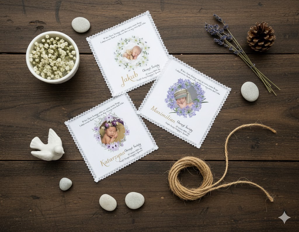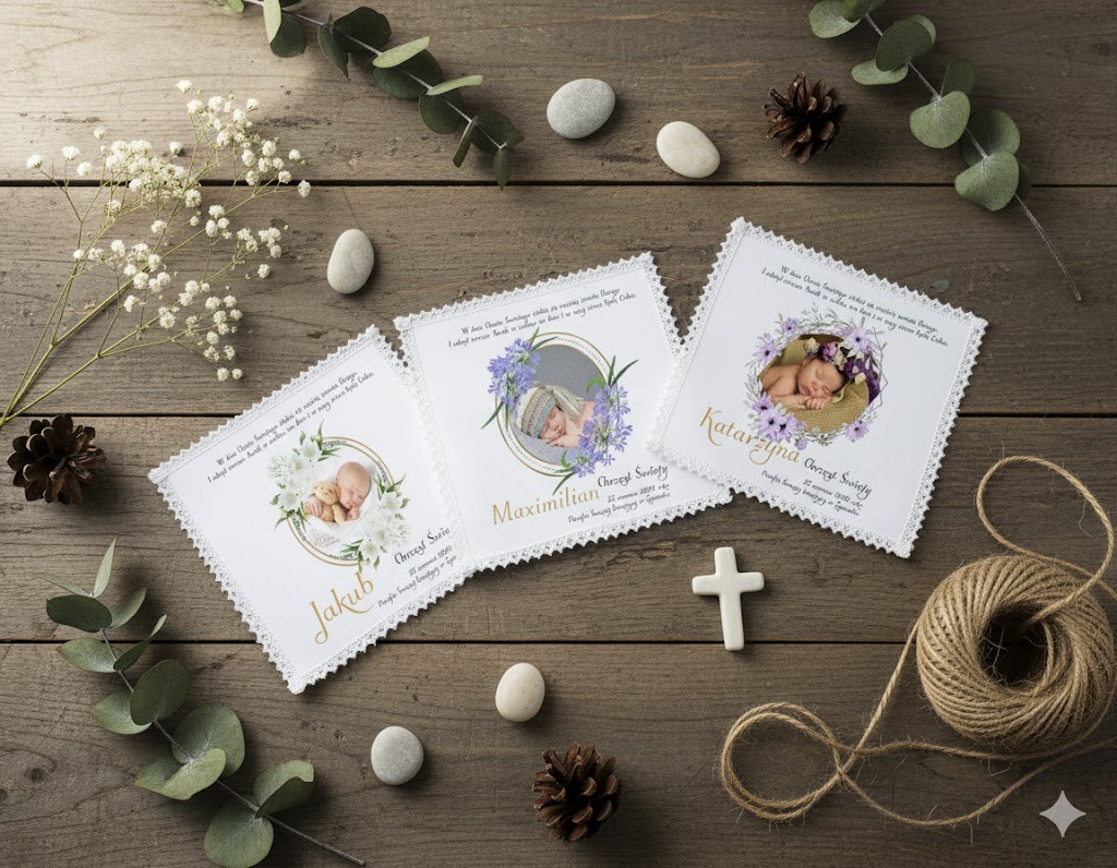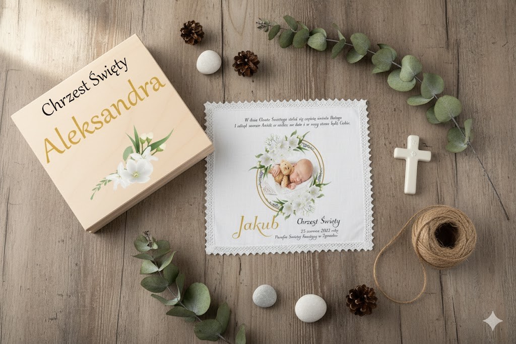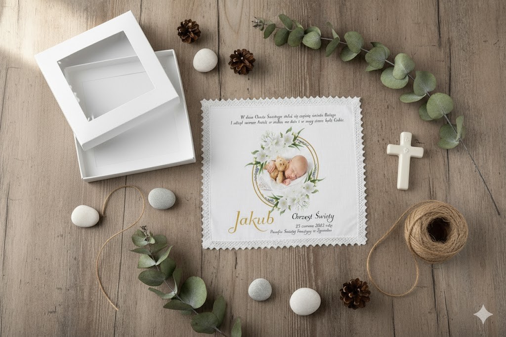 Personalizacja zdjęciem, imieniem i datą czyni szatkę wyjątkową i niepowtarzalną — pamiątka z duszą.