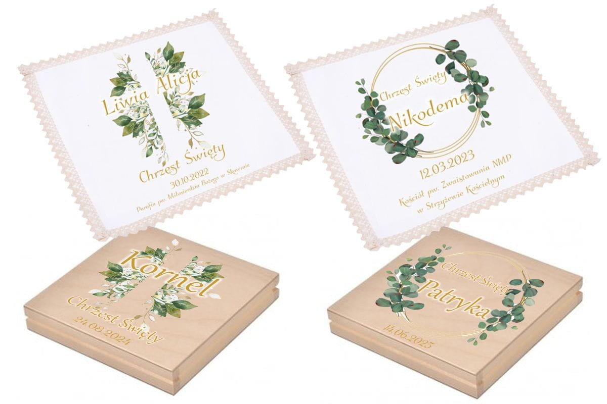 Unikatowa szatka do Chrztu Świętego w formie chusteczki, wykonana z eleganckiej tkaniny satynowej, ozdobiona pięknym motywem EUKALIPTUSU oraz personalizacją imienia dziecka i daty w stylowej aranżacji. W tym wyjątkowym modelu zastosowaliśmy bryłę z delikatnymi kwiatami, symbolizującą koronę, w odcieniach pastelowych dodatków. Symbolika liści eukaliptusa ma za zadanie chronić dziecko przed złem i życzyć mu obfitości.