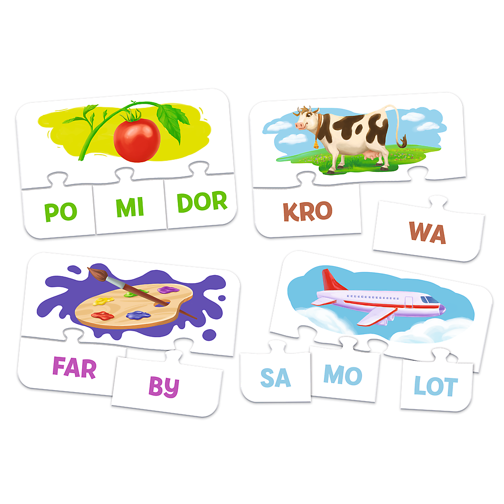 Sylaby to edukacyjna układanka dla przedszkolaków, która w przyjazny sposób wprowadza dzieci w świat sylabizowania. Poprzez zabawę maluchy uczą się rozpoznawać litery, dzielić słowa na sylaby i tworzyć z nich nowe wyrazy. Gra rozwija pamięć, pobudza wyobraźnię oraz wzbogaca słownictwo, wspierając naukę czytania. To doskonały sposób na połączenie nauki z radością odkrywania języka!
