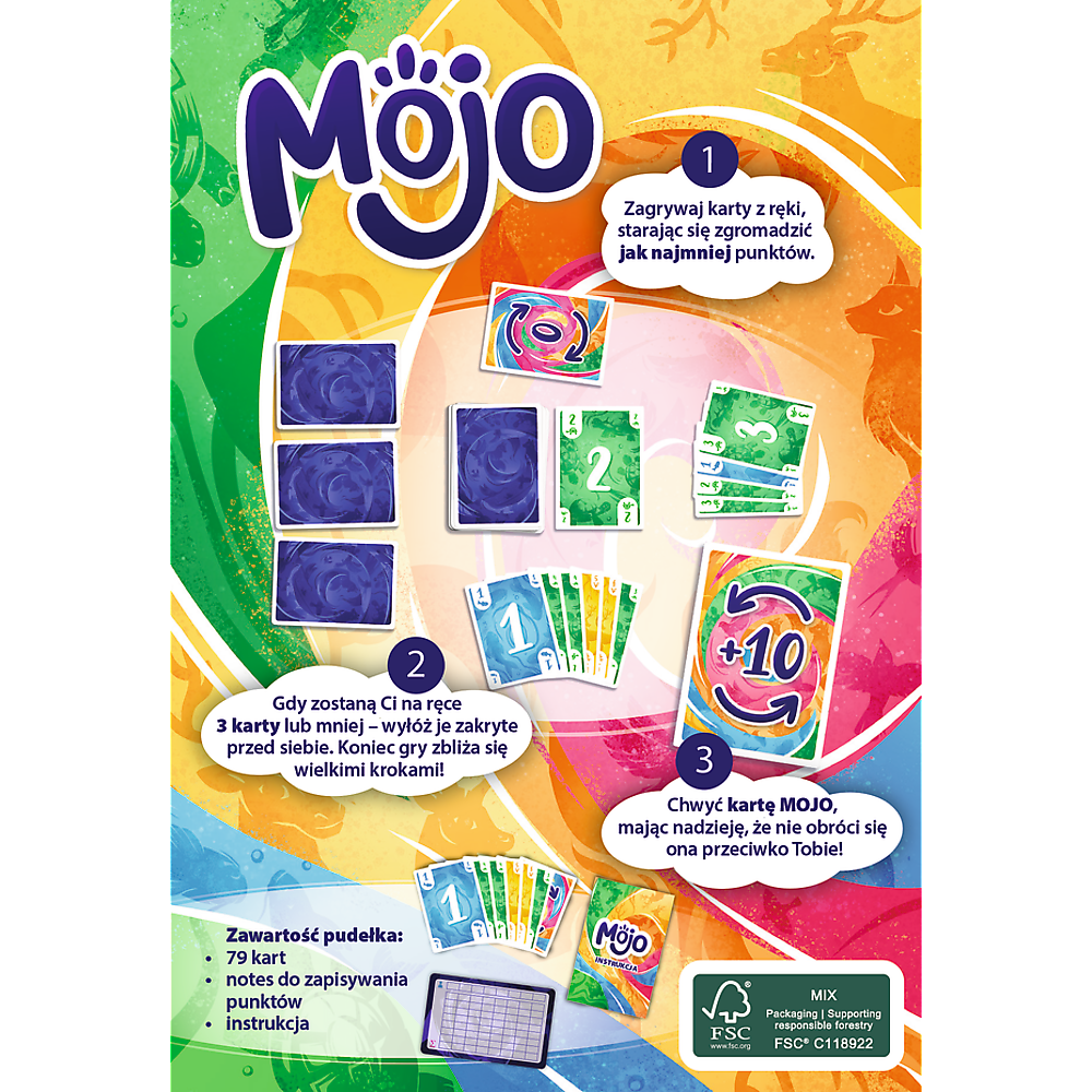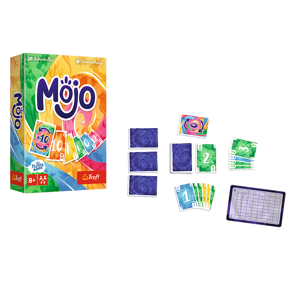 Mojo to dynamiczna gra karciana, w której celem gracza jest osiągnięcie jak najniższego wyniku. To na pozór proste zadanie wymaga jednak odrobiny strategii – nie obędzie się bez decydowania, czy pozbędziesz się kart o najwyższych wartościach, czy może spróbujesz ograniczyć karty w ręce do jednego koloru.